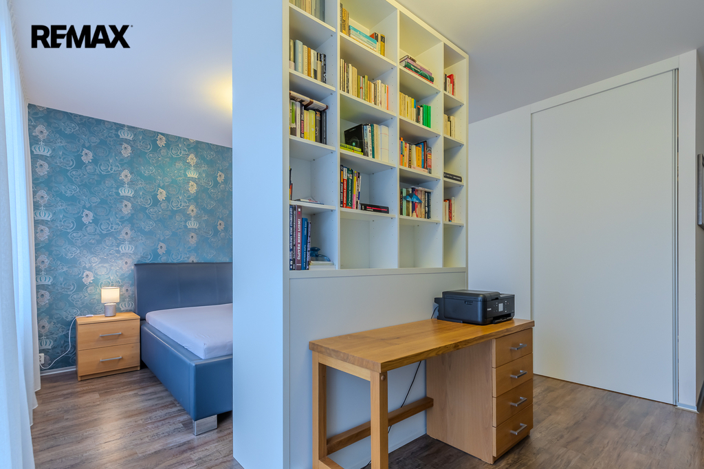 Prostorové uspořádání bytu je pojaté velkoryse. Celkovou plochu 110m2 tvoří : užitná plocha bytu - 95m2 + terasa - 12m2 + balkon - 3m2. Dispozici tvoří obývací pokoj s kuchyňským koutem (36,6m2), na nějž navazuje východně orientovaná zastřešená terasa s výhledem na Kunratický les. Dvě samostatné ložnice (26m2 a 12m2), 2x šatna, samostatné wc a koupelna se sprchovým koutem i vanou.