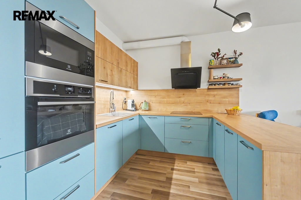• Byt je vybaven moderní kuchyní s vestavěnými spotřebiči (myčka, digestoř, varná deska, trouba a vestavěná mikrovlnka).