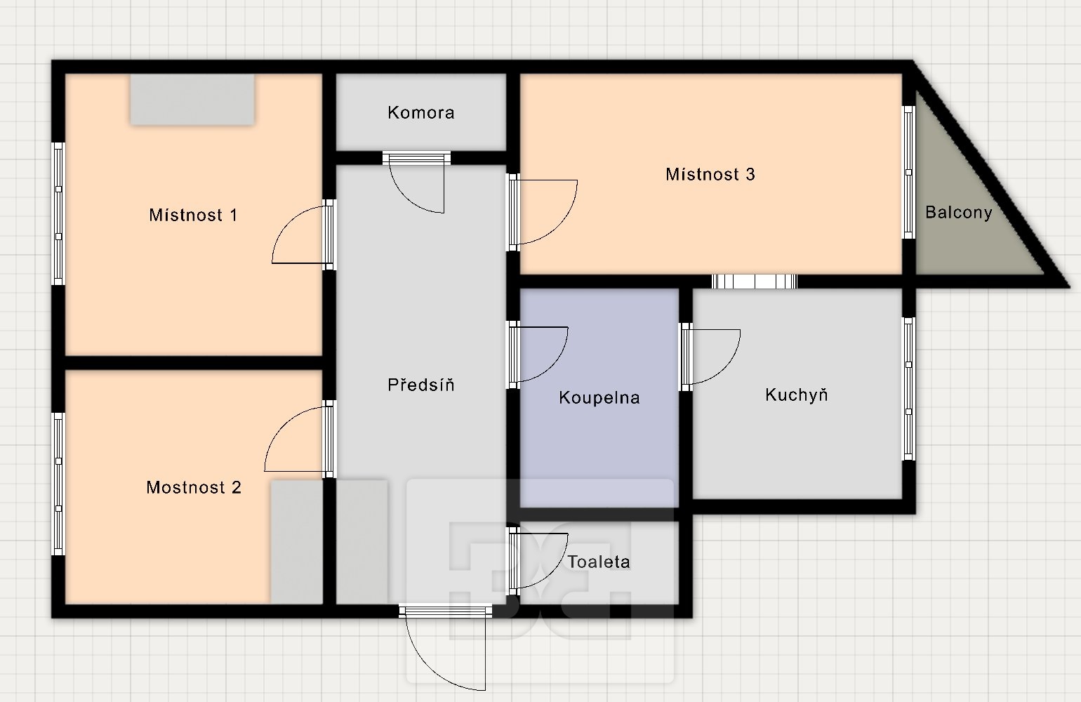 Dominantou bytu jsou velká okna, díky nimž je interiér krásně prosvětlený po celý den. Praktická dispozice nabízí tři samostatné pokoje, které poskytují dostatek soukromí i prostoru pro pohodlné bydlení.