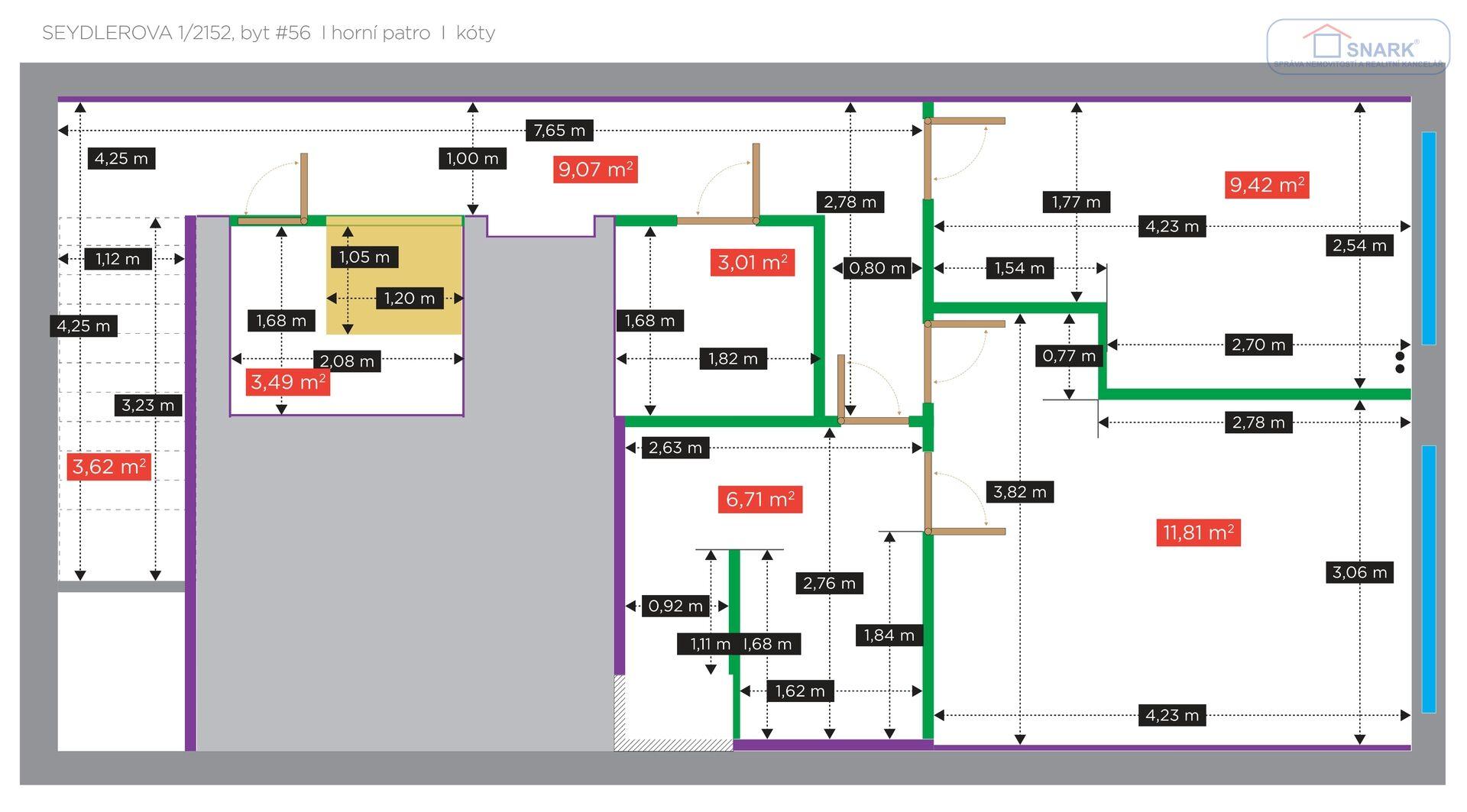 Byt se nachází v 7. a 8. nadzemním podlaží bytového domu. V domě jsou dva výtahy, vchody jsou na čip (stejně tak i vchod do sklepních prostor). Parkování možno v okolních ulicích.