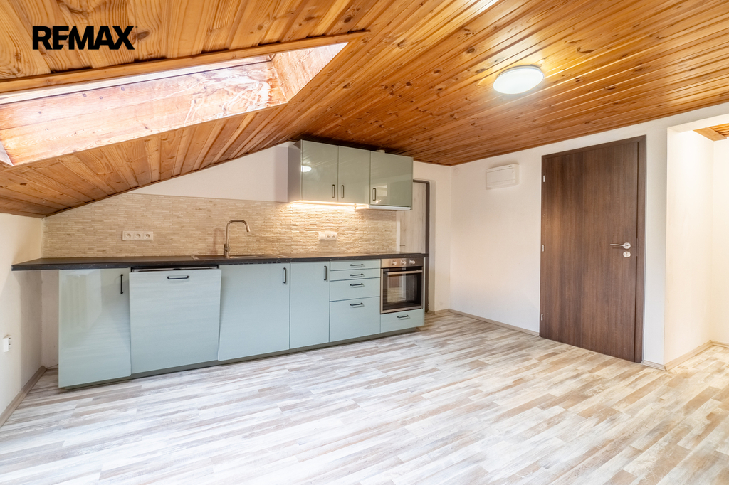 Dispozičně byt nabízí dva samostatné pokoje a velkorysý obývací prostor s kuchyňským koutem, který tvoří přirozené centrum celého bytu a poskytuje dostatek místa pro každodenní život i odpočinek. Kuchyňská linka je prakticky řešená a plynule navazuje na obytnou část. Koupelna je prostorná a nabízí jak vanu, tak sprchový kout, což zvyšuje komfort užívání. Díky podkrovnímu charakteru a dostatku oken působí interiér velmi světlým a vzdušným dojmem a je připraven k okamžitému nastěhování.