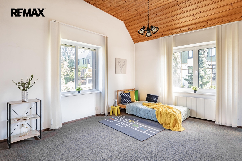 V podzemním podlaží najdete místnost s vnitřním bazénem Desjoyaux, kde se můžete koupat po celý rok. Dále se dům skládá ze dvou nadzemních podlaží a obytného podkroví. Interiér je vybaven kuchyňskou linkou se spotřebiči a dohromady tady máte 4 koupelny a toalety. Samozřejmě nechybí plastová okna. Přes celou šířku domu je balkon s výhledem do ulice a na opačné straně menší balkon s pohledem do zahrady.