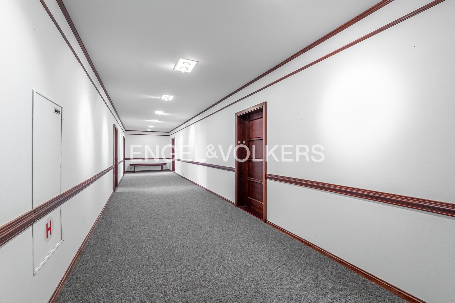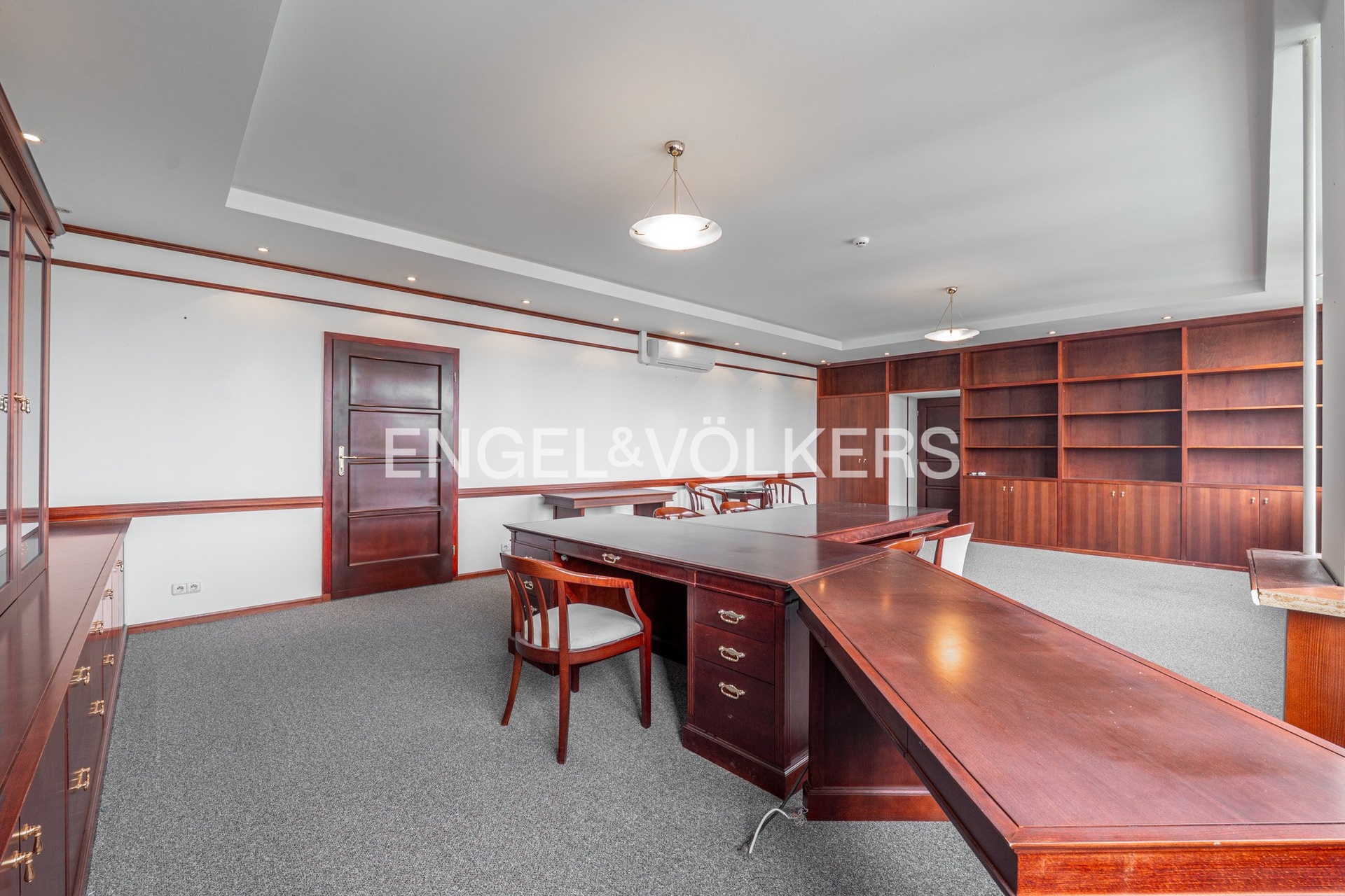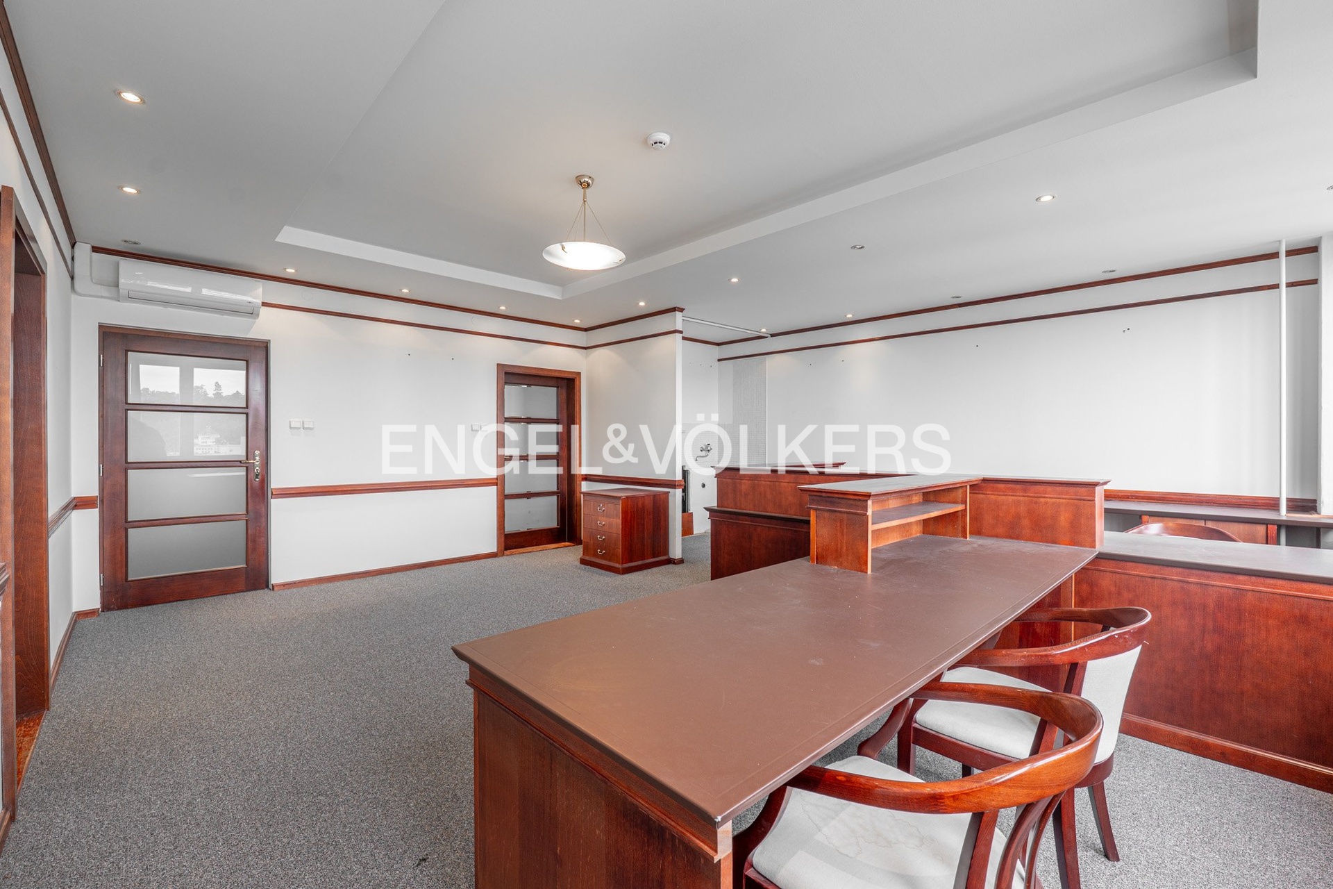 Interiér prostor je proveden ve vysokém standardu. Vstup zajišťují masivní dřevěné dveře a na podlahách je položen kvalitní zátěžový koberec. Světlé podhledy jsou elegantně doplněny kombinací bodového LED osvětlení a designových lustrů, což vytváří příjemnou a zároveň profesionální atmosféru. Velká plastová otevíratelná okna s dvojsklem jsou osazena svislými textilními žaluziemi pro regulaci světla a zajištění soukromí. Celý prostor je vybaven luxusním nábytkem z dřevěného masivu vyrobeným na míru a plně klimatizován pro maximální pracovní pohodlí.