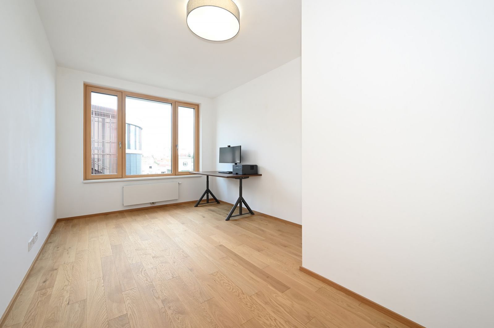 Součástí bytu je také praktická komora, ve které je k dispozici pračka a sušička značky Bosch. V celém bytě jsou kvalitní dřevěné podlahy a elektrické předokenní žaluzie, které umožňují regulaci světla i soukromí. Samozřejmostí je také rekuperace vzduchu, která přispívá ke zdravému a úspornému provozu domácnosti.