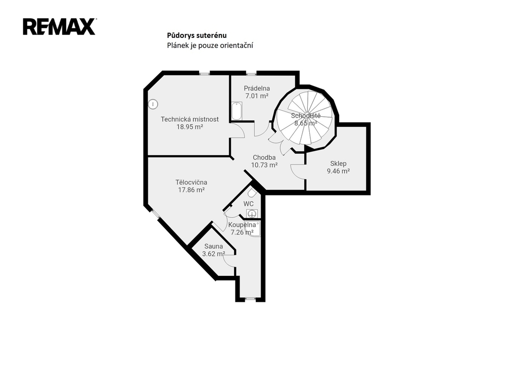 Suterén domu slouží jako relaxační a technické zázemí. Sauna, posilovna a koupelnou se samostatným WC, dále prádelna, kotelna a sklep vhodně doplňují vybavení domu.