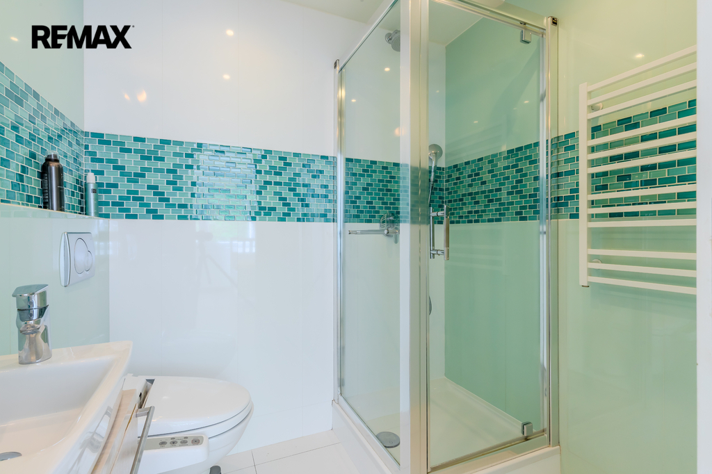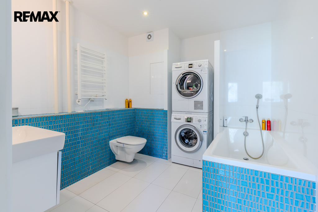 K dispozici jsou celkem dvě koupelny v nadstandardním provedení (sanita Laufen a Roca, designové obklady Los Kachlos), což výrazně zvyšuje komfort každodenního života.