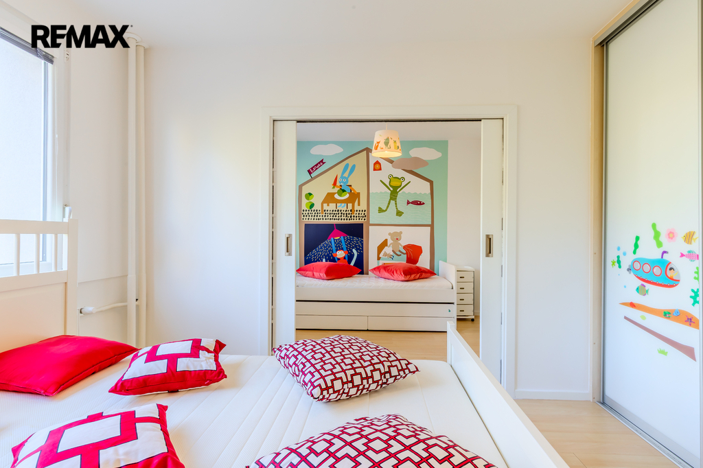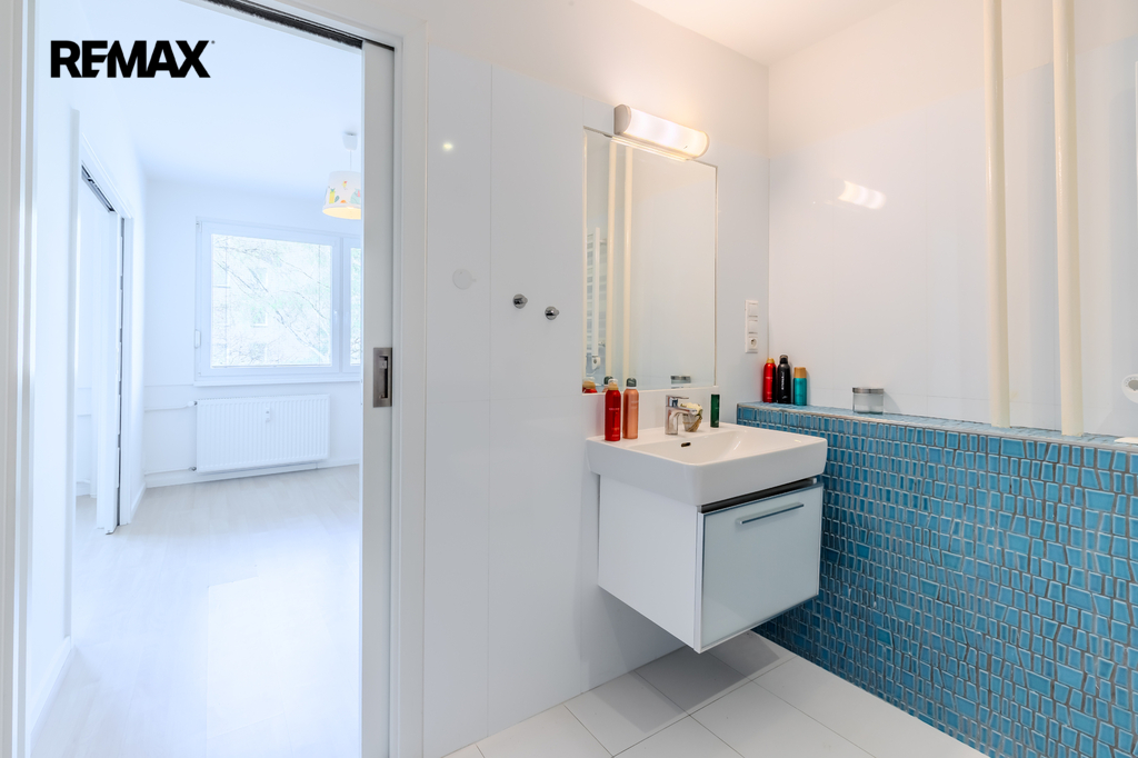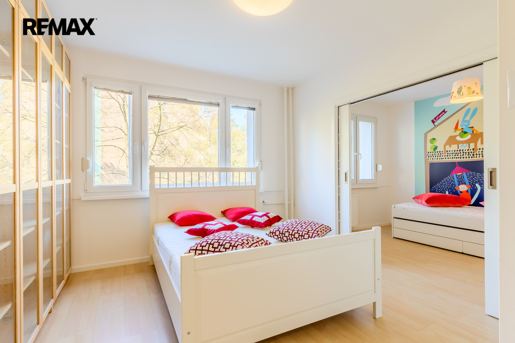 Samozřejmostí jsou vestavěné skříně Woodface ve všech pokojích i na chodbě, klimatizace ve dvou místnostech, nová elektroinstalace, podlahy i plastová okna. Praktická komora přímo naproti bytu (1 m²) nabízí další úložný prostor.