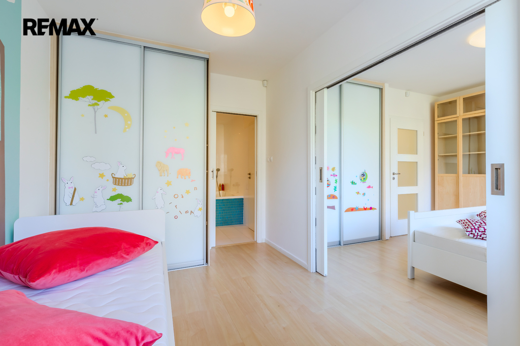 Tři samostatné ložnice poskytují dostatek soukromí pro rodinu i práci z domova. Jedna z nich má navíc vlastní koupelnu s WC – ideální jako rodičovské zázemí.
