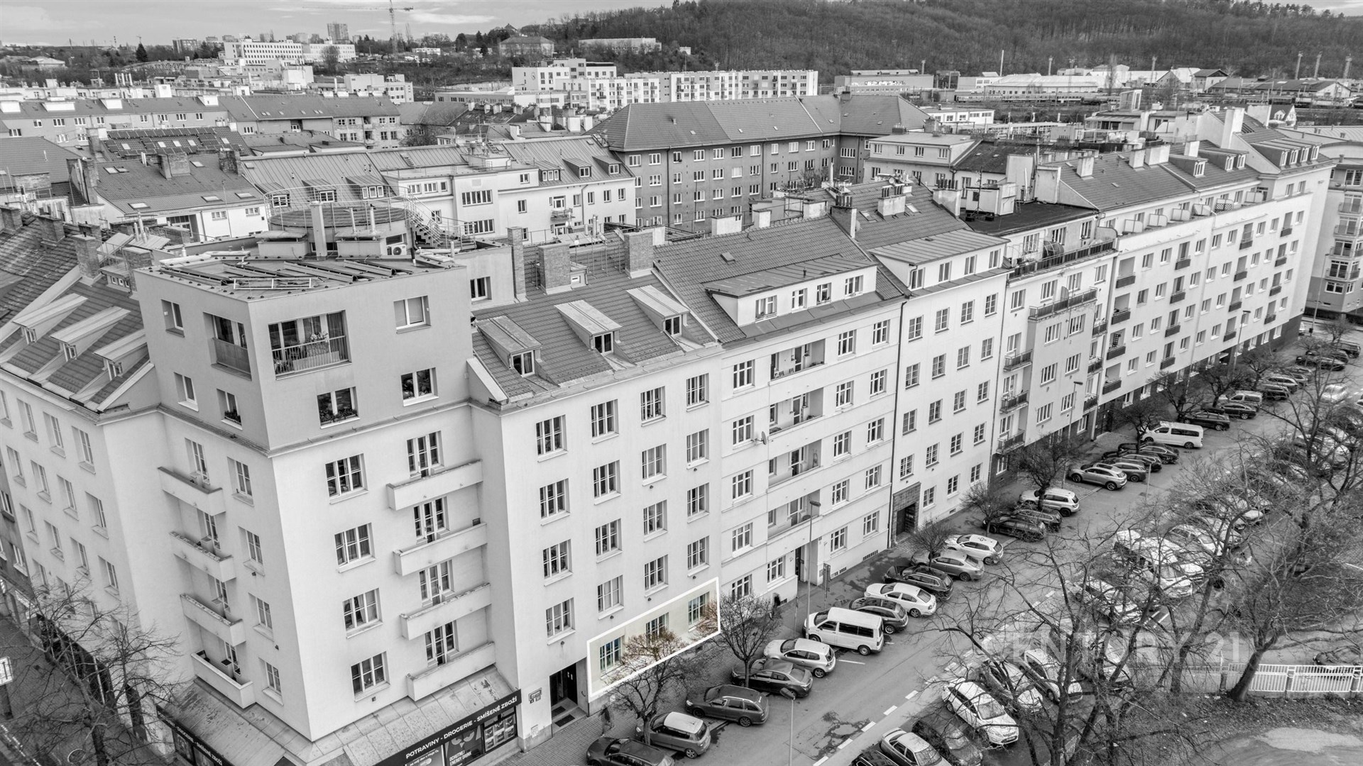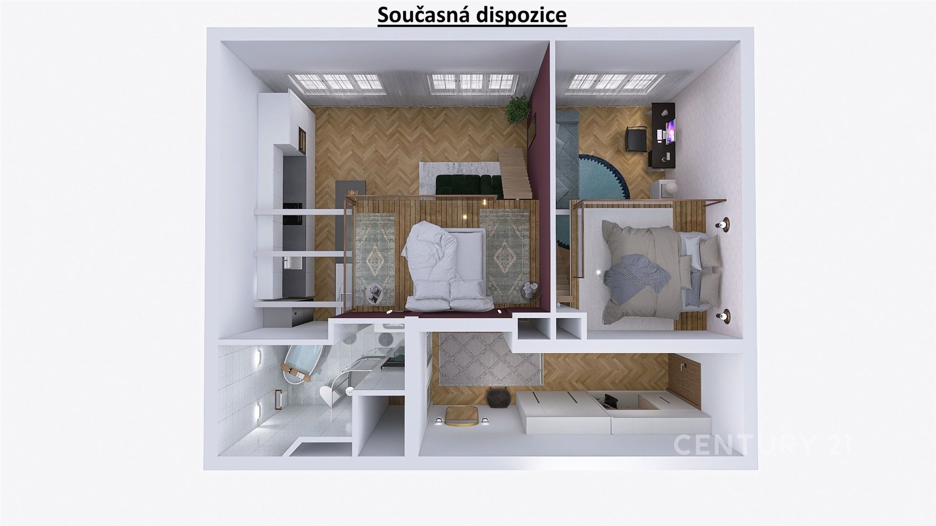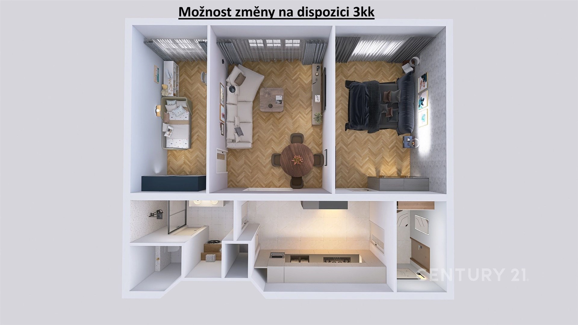 Je důležité zmínit, že byt je v současnosti obýván nájemníky a jeho stav odpovídá dlouhodobému investičnímu užívání. V prezentaci jsou proto použity fotografie bez aktuálního vybavení a ukazují jeho potenciál po uvolnění. Fotografie aktuálního stavu bytu jsou k dispozici na vyžádání. Součástí prezentace jsou rovněž půdorysy obou dispozičních variant.