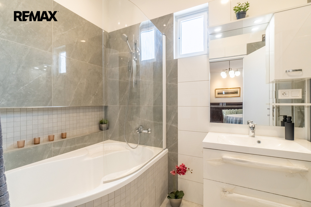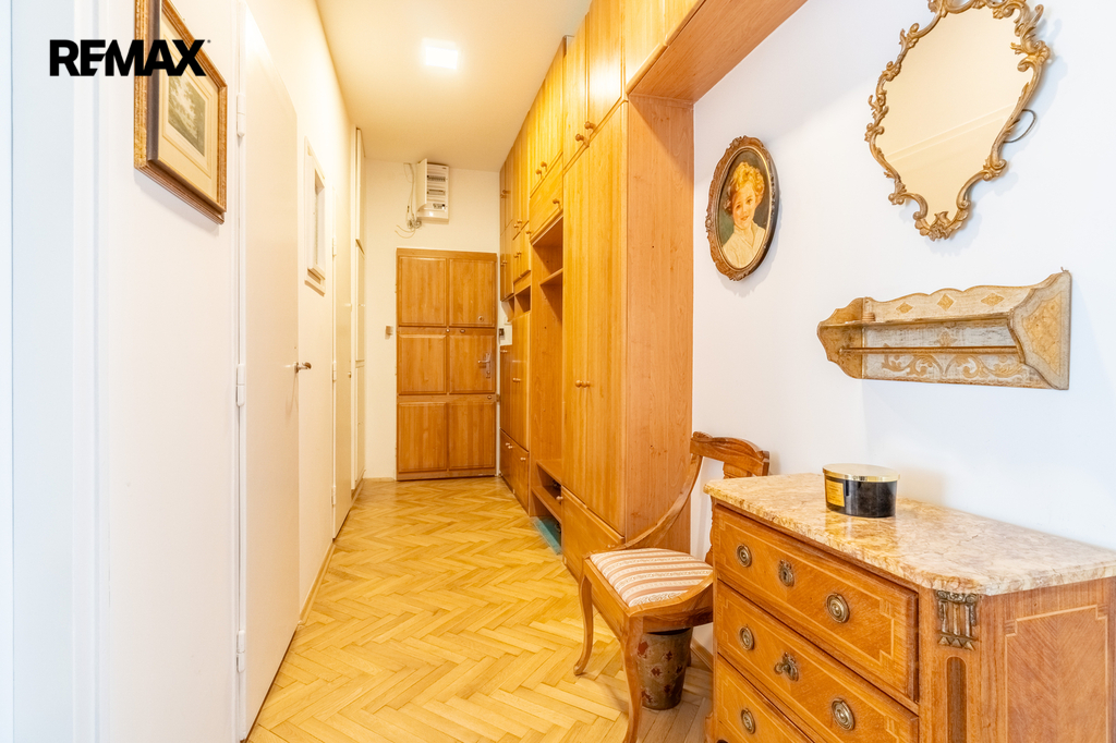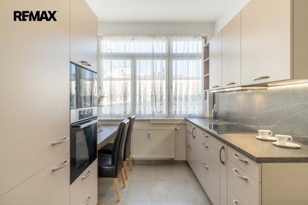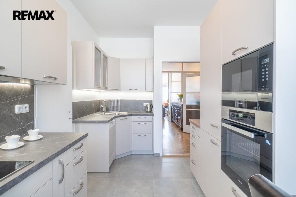 Interiér vyniká vysokými stropy (3,4 m) a velkorysými místnostmi. Byt prošel kompletní rekonstrukcí – k dispozici je zcela nová kuchyň i koupelny, vše ve vysokém standardu.