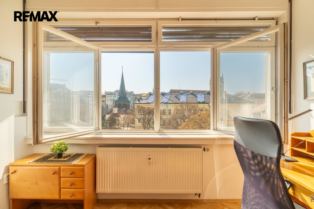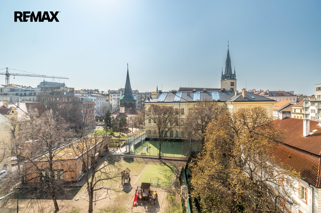 Hlavní předností bytu jsou otevřené výhledy na historické centrum Prahy, včetně věží kostelů Kostel svatého Štěpána a Kostel svatého Apolináře. Díky vyššímu patru je byt krásně prosvětlený a zároveň nabízí překvapivě klidné bydlení bez výrazného ruchu ulice.