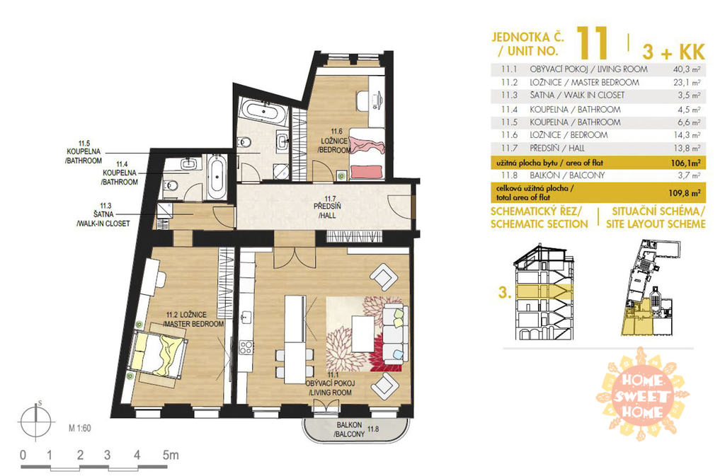 | Dispozice/podlahová plocha: | 3+kk/108 m² |