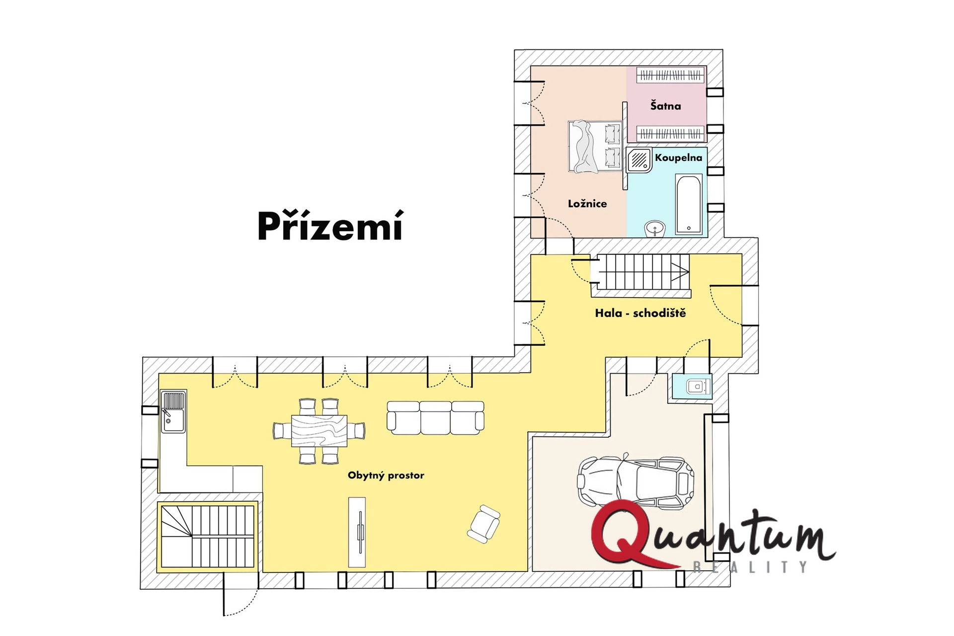 Obývací pokoj s krbem, kuchyní, se vstupem na terasu, ložnice s vlastní koupelnou a šatnou se vstupem na terasu, hala, toaleta pro hosty, technická místnost, garáž