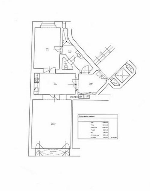 Prostory se nachází v 1.patře s výtahem. Celková plocha činí 76 m2 a sestává ze předsíně, haly s kuch. koutem, 2 místností (větší disponuje navíc zimní zahradou), koupelny a WC. Na podlaze je teraco.