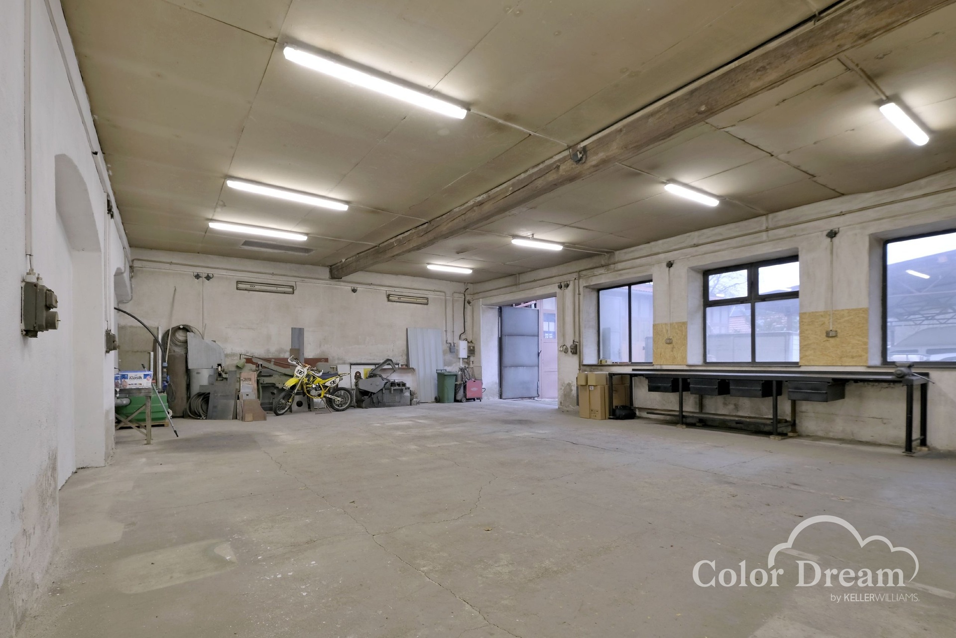 K dispozici také robustní pracovní stůl – ponk cca 7 × 1,2 m, ideální pro výrobu či montáže