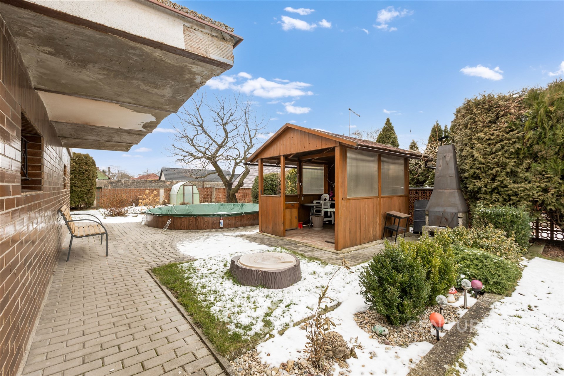 Nemovitost je obklopena dobře udržovanou zahradou, která nabízí perfektní prostor pro relaxaci, hry pro děti či venkovní grilování s rodinou a přáteli.