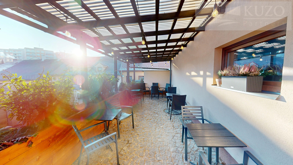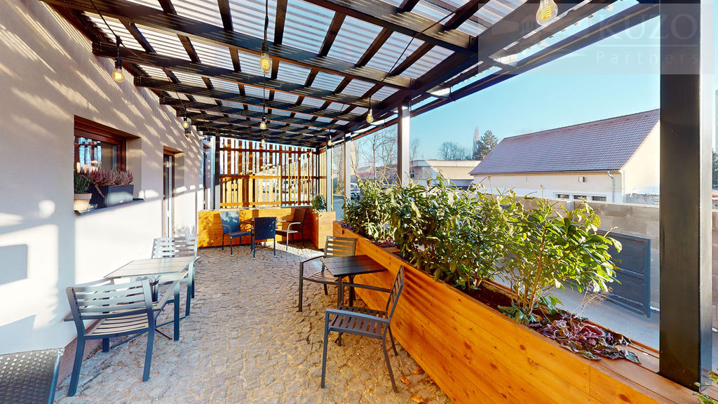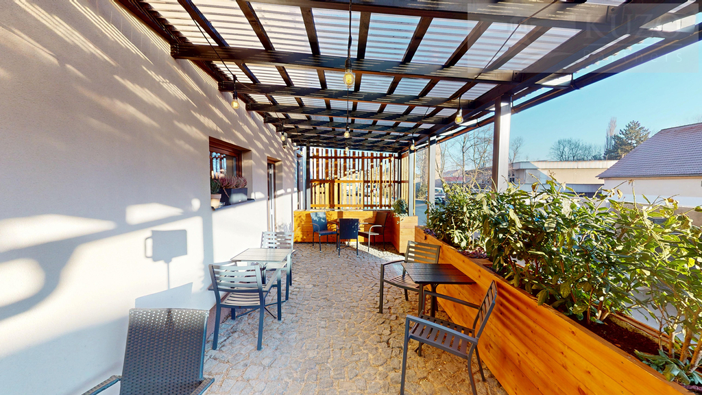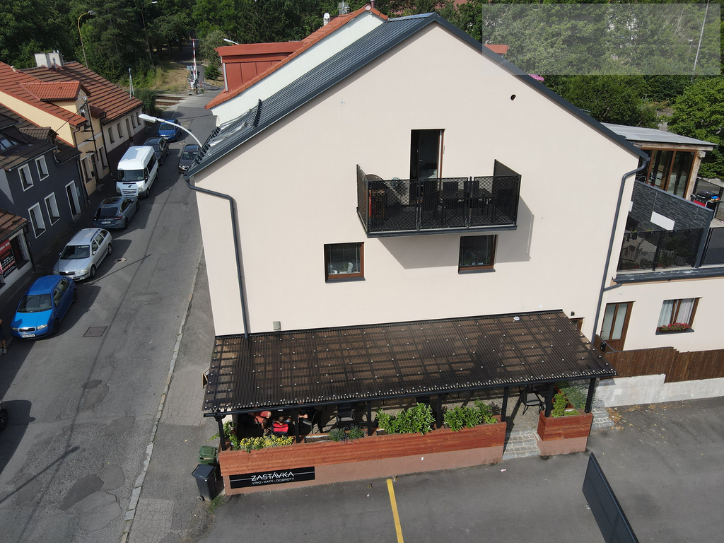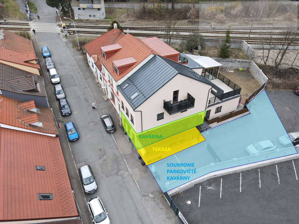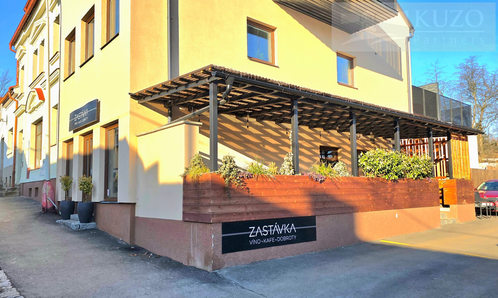 PRODÁVÁ SE KOMPLET: Nemovitost, VLASTNÍ TERASA (bez nájmu městu) a VLASTNÍ PARKOVIŠTĚ pro zákazníky (4 vozy) + 2 místa pronajatá od města.