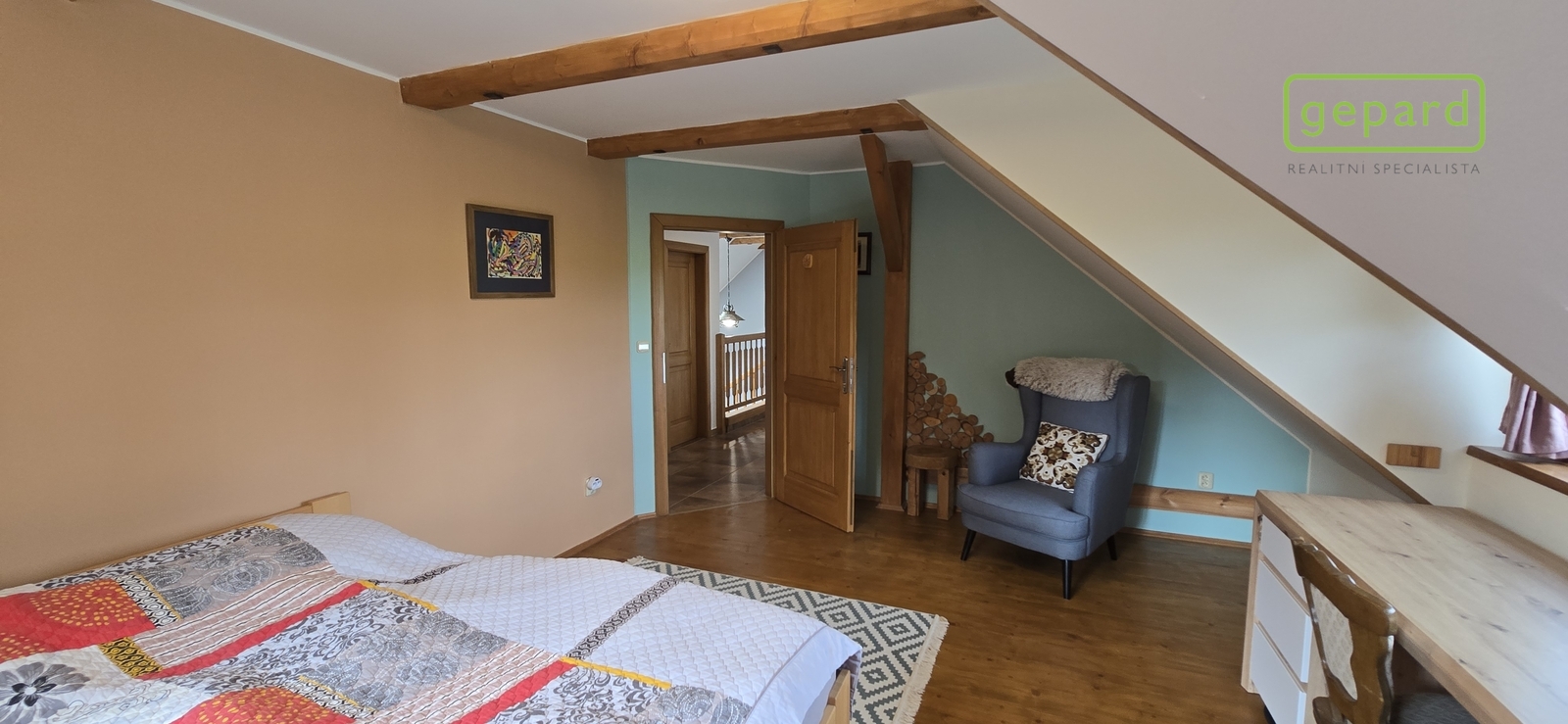 Dále posuvné dveře oddělující druhý byt se samostatným vstupem z protilehlé části domu, schodiště do patra, kde se z centrální chodby vstupuje do čtyřech podkrovních pokojům samostatné koupelny, malé kuchyně a technické místnosti.