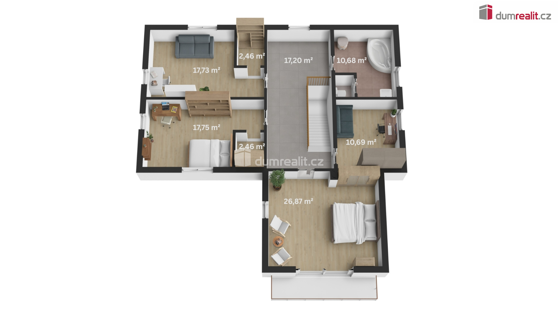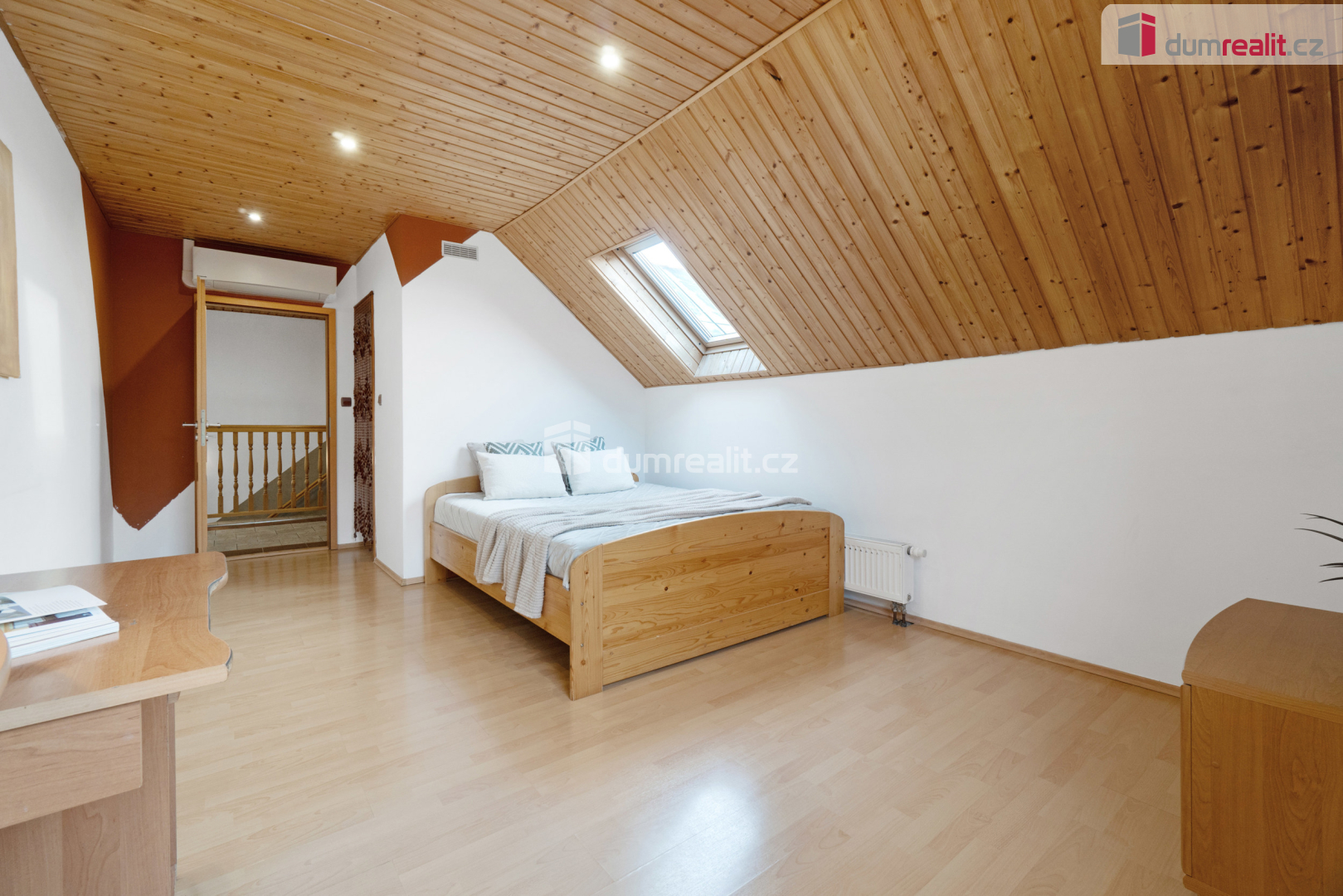 Podkroví: čtyři samostatné pokoje se šatnami a balkonem, koupelna, vstup na zateplenou půdu