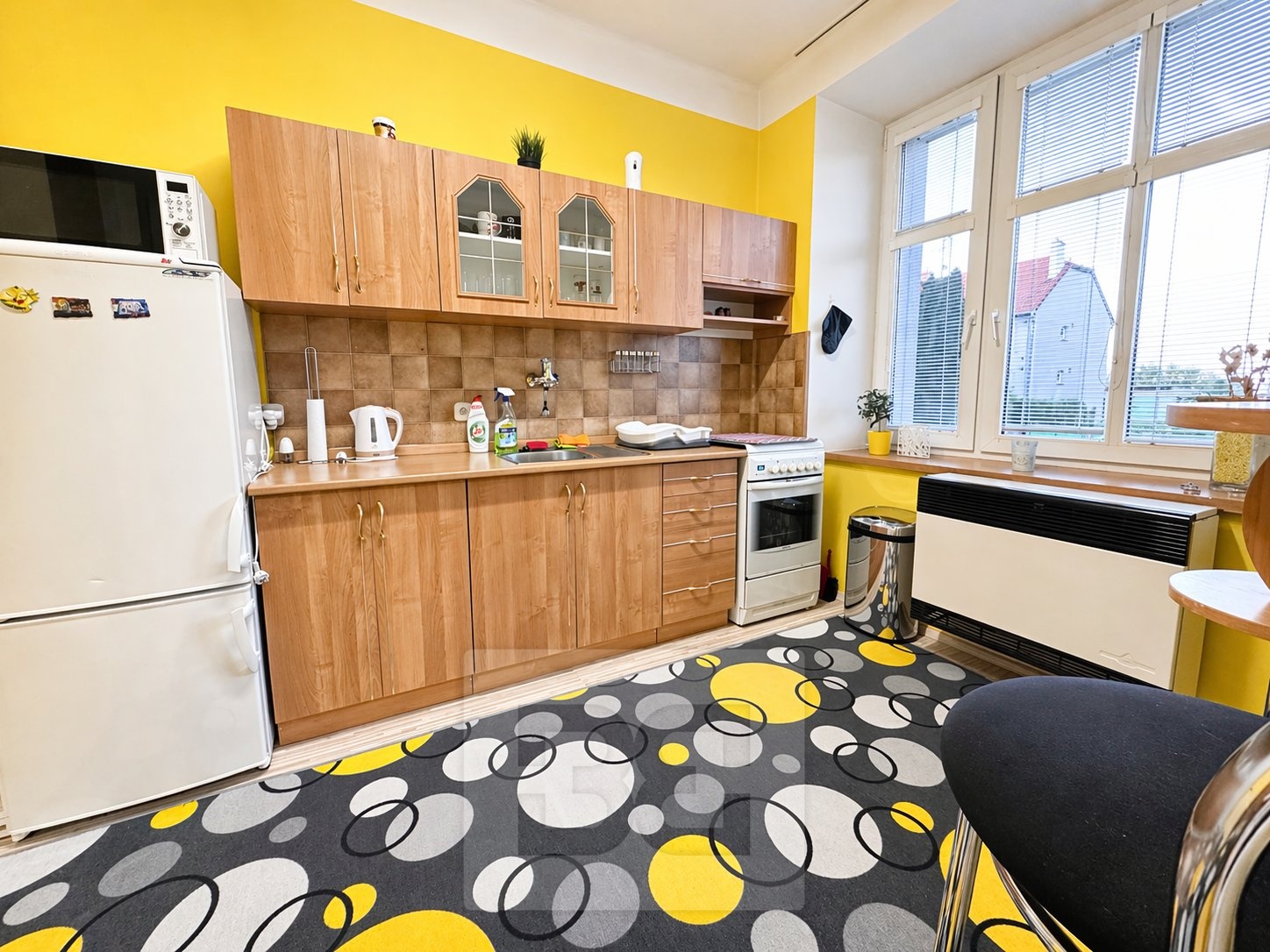 Dispozice bytu nabízí samostatnou kuchyni a prostorný obytný pokoj. Kuchyň je vybavena kuchyňskou linkou, sporákem, lednicí a základními spotřebiči. Obývací část poskytuje dostatek prostoru pro pohodlné bydlení i pracovní zázemí. Koupelna je vybavena vanou a umyvadlem, toaleta je samostatně.