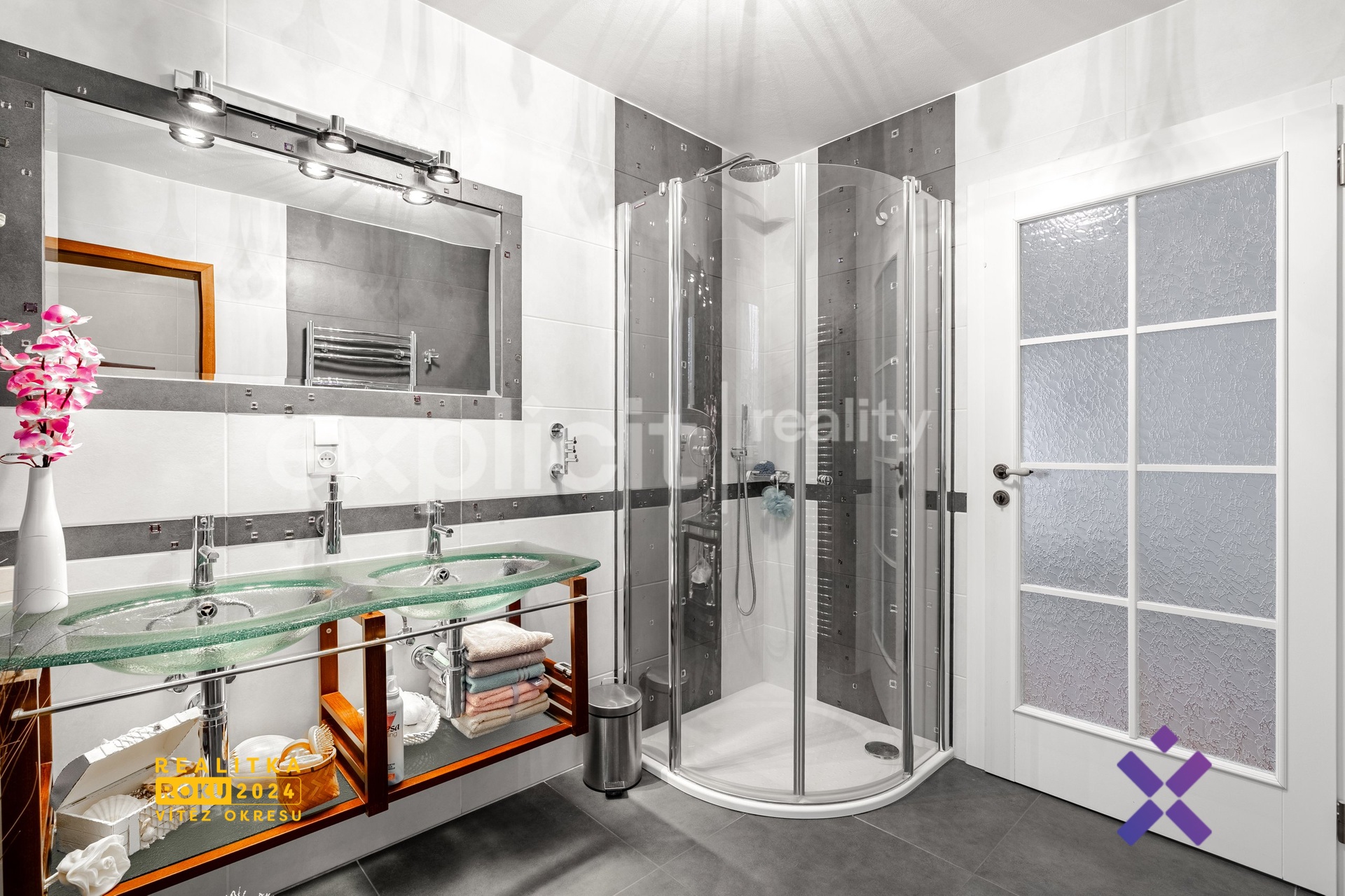 Po vstupu do domu vás přivítá prostorné zádveří, ze kterého je přístup do všech hlavních místností přízemí. Na pravé straně se nachází koupelna se sprchovým koutem, topným žebříkem a oddělenou toaletou. Zajímavostí koupelny jsou dvě skleněná umyvadla a lustr Swarovski. Na levé straně prádelna se sušárnou. Ve vedlejší místnosti je pracovna s koženou sedací soupravou a pracovním stolem, ideální pro práci z domova nebo přijímání hostů. Dále se v přízemí nachází šatna, spíž a technické zázemí, což zajišťuje praktický komfort každodenního života.