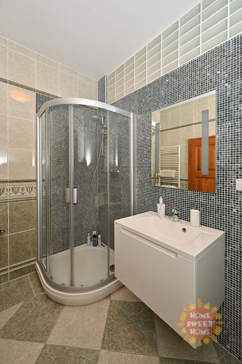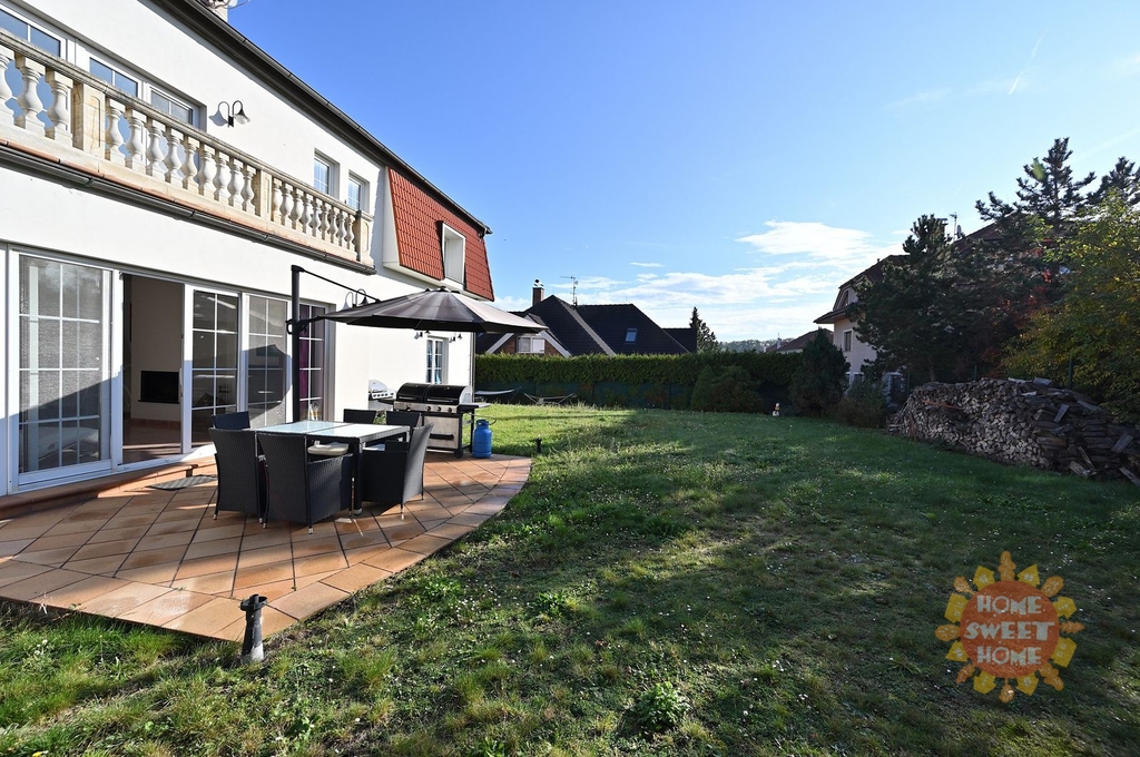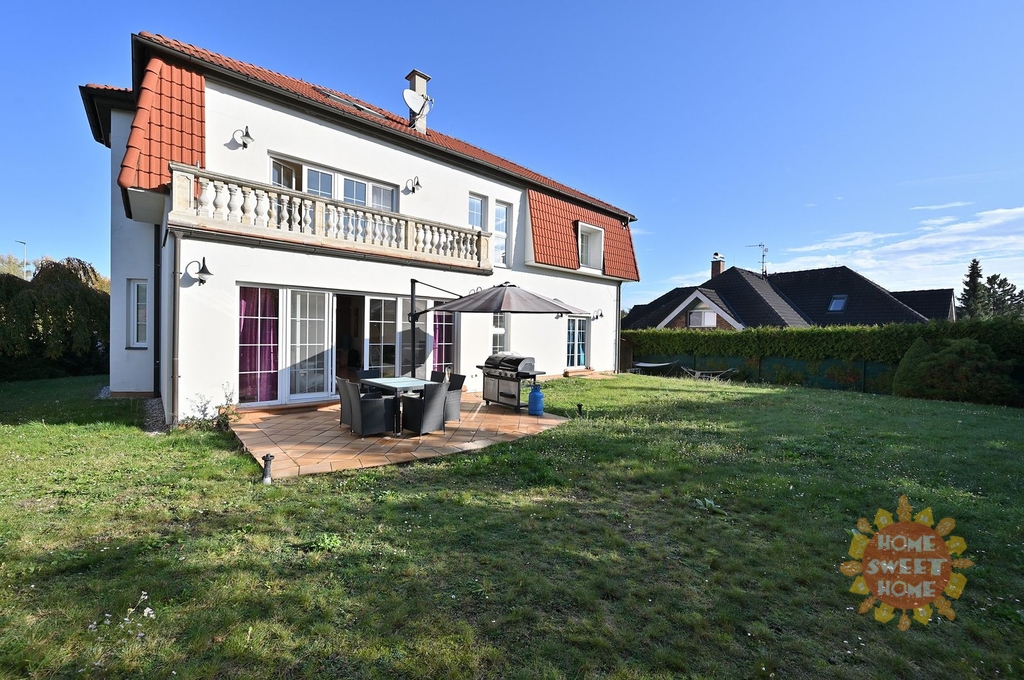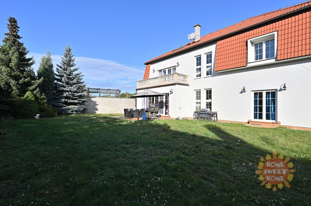 V přízemí domu se nachází vstupní chodba, hala s honosným schodištěm, prostorný obývací pokoj s krbem a přístupem na terasu a na zahradu, s jídelní částí a kuchyňským koutem vybaveným vestavěným spotřebiči vč. myčky nádobí. Dále je v přízemí ložnice pro hosty s přístupem na zahradu a koupelna s toaletou. V prvním patře je prostorná galerie a další čtyři ložnice - hlavní ložnice s přístupem na terasu, dále jsou zde dvě koupelny s toaletou. Jedna s masážní vanou a sprchovým koutem, druhá koupelna se sprchovým koutem. Ve druhém patře je otevřený prostor, aktuálně využívaný jako fitness, ložnice a další koupelna s toaletou. Výhodou bydlení je také velká garáž pro dva vozy.