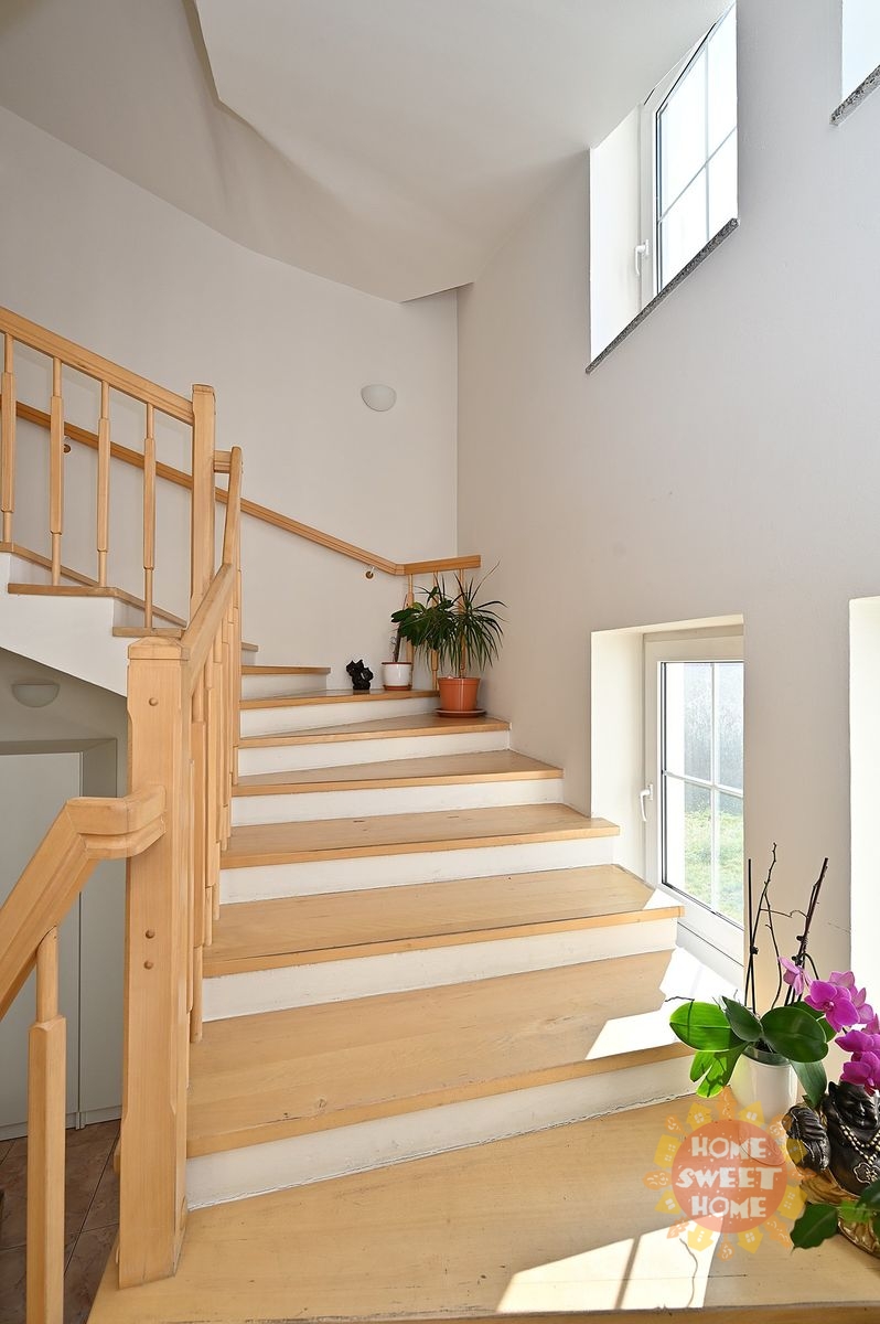 Dům má hezké dřevěné schodiště, v místnostech jsou na podlahách parkety a dlažba. Dům má centrální vysavač, vytápění zajišťuje plynový kotel. Dále jsou v domě požární čidla, ADSL, satelit, alarm.