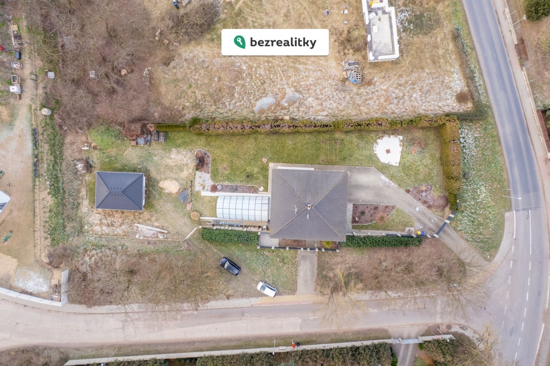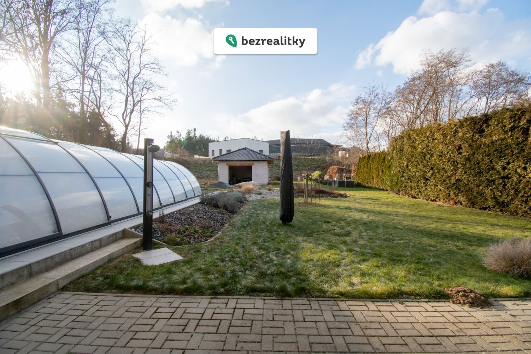 U domu je velký bazén se zastřešením a s místností pro jeho zázemí, bazén je vyhříván dalším tepelným čerpadlem. Na upravené velké zahradě se nachází další garáž, zmíněný bazén se zázemím, rozestavěná garáž, ohniště a před vjezdem do garáže v domě prostor pro pořádání zahradních party. Na zahradu jsou 2 vjezdy + hlavní vchod, kde je parkování pro 2 auta.