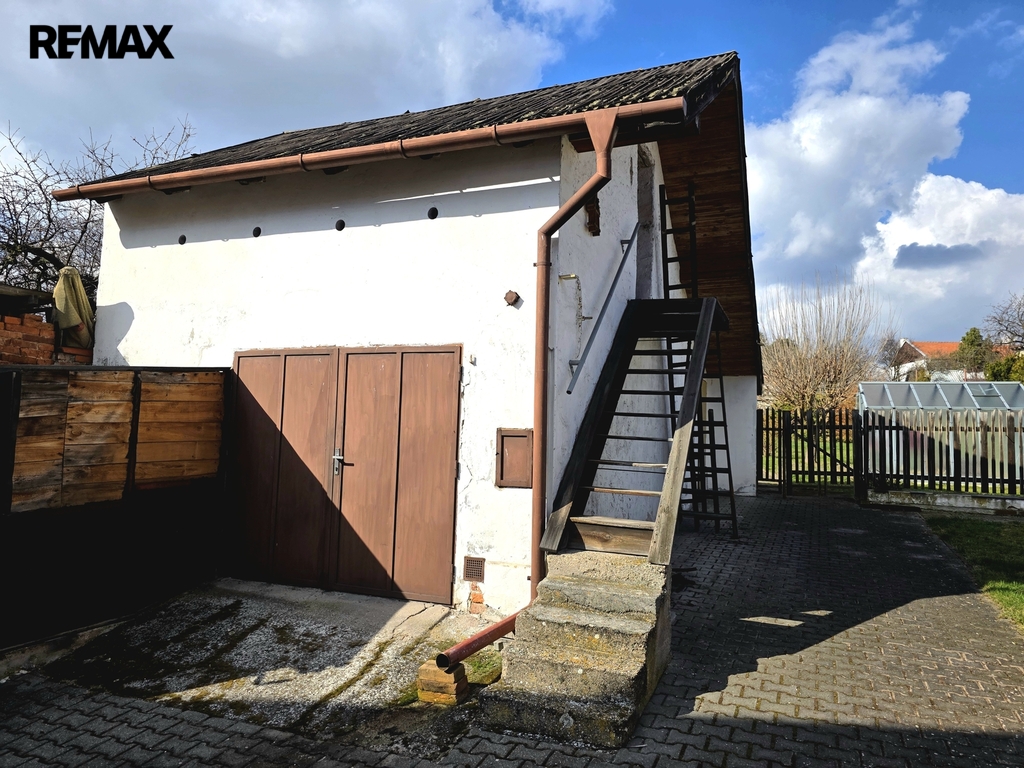 • Hospodářské zázemí: Na dvoře stojí samostatná stavba (stodola) s vraty a vlastním patrem. V přízemí je rozděleno na dvě části. První je využívána jako garáž/dílna a druhá část slouží jako sklad zahradního náčiní. Tento prostor je velmi vhodný např. na vybudování letní kuchyně.