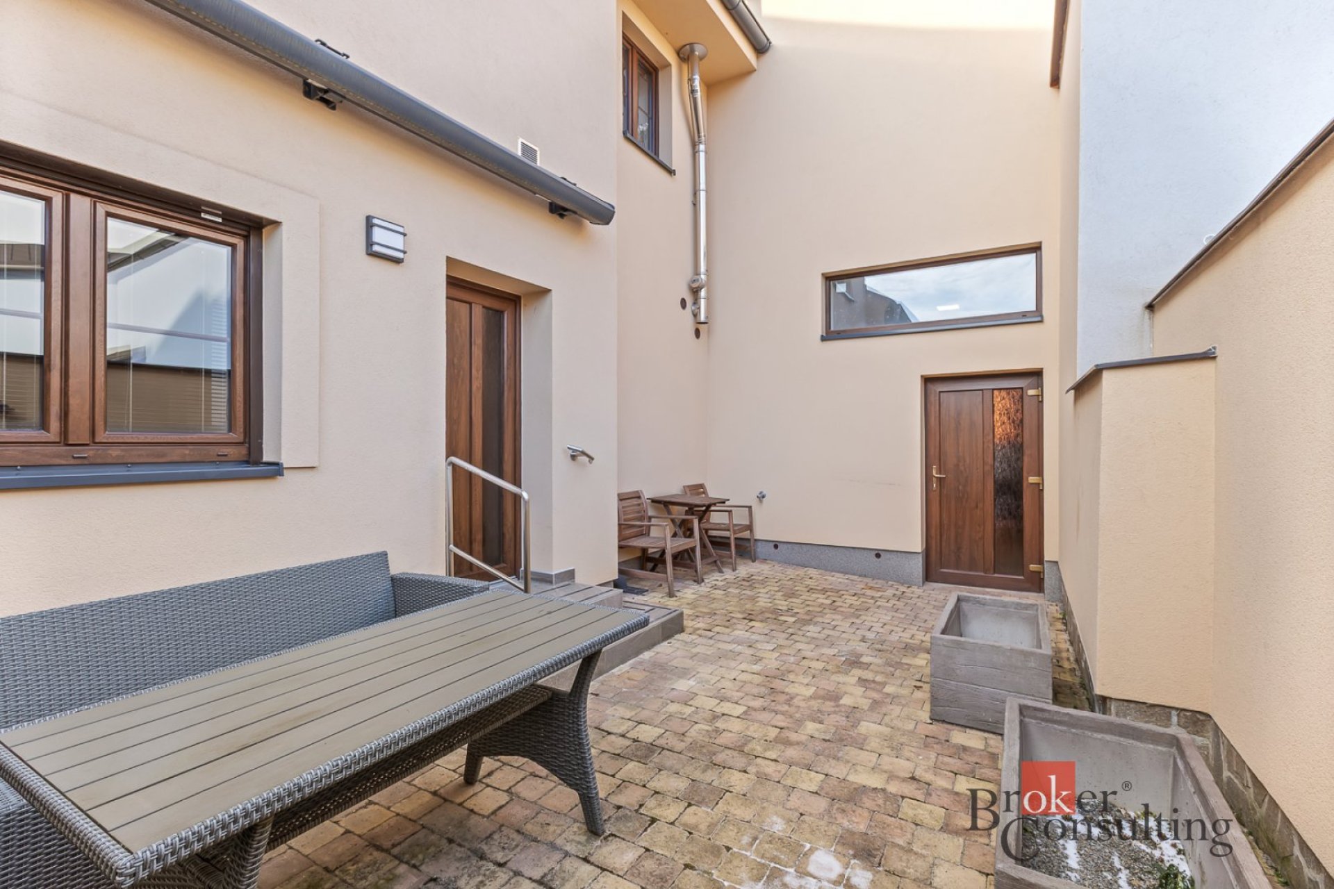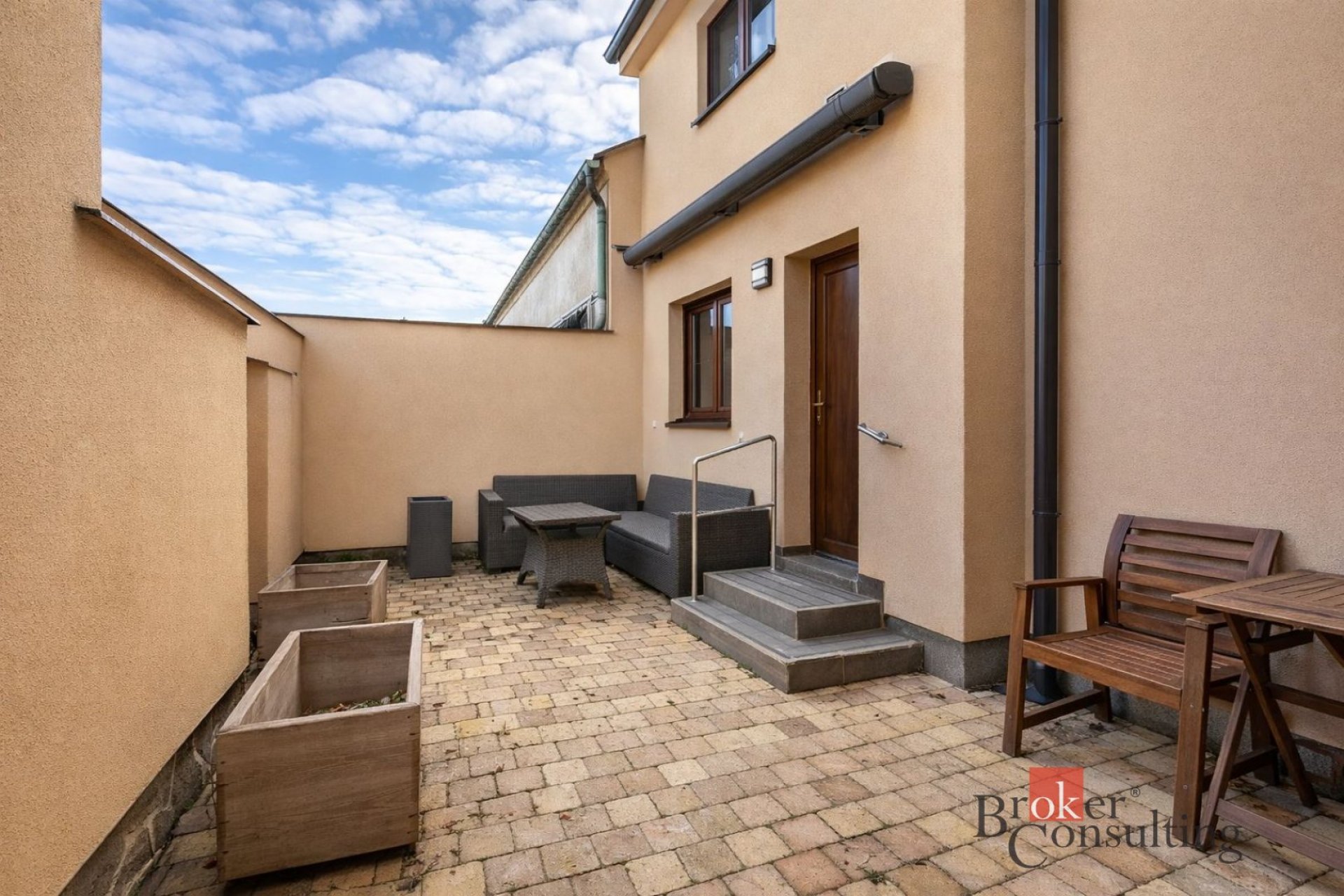Velkou přidanou hodnotou bytu je prostorná terasa o výměře 22 m² v osobním vlastnictví, která poskytuje plně soukromý venkovní prostor (nejedná se o společný dvůr). Terasa je orientována do klidného vnitrobloku, osazena kvalitní dlažbou a vybavena automatickou markýzou – stínění je tak možné ovládat jedním tlačítkem. Prostor je ideální pro ranní kávu, večerní odpočinek, či grilování.