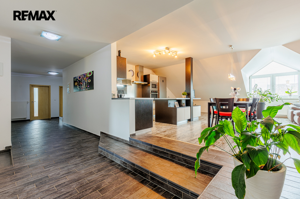 V patře, které bylo dostavěno v roce 2010, se nachází prostorný byt o dispozici 6+kk a celkové užitné ploše 174 m². Dominantou bytu je velký obývací pokoj s kuchyňským koutem, který působí vzdušně a nabízí spoustu prostoru pro rodinu i přátele. Dále jsou zde čtyři samostatné ložnice, pracovna, koupelna s vanou i sprchovým koutem, oddělené WC a komora. Byt je nadstandardně vybaven, světlý a pečlivě navržený do posledního detailu, aby poskytoval maximální komfort pro rodinné bydlení i případné pronájmy.