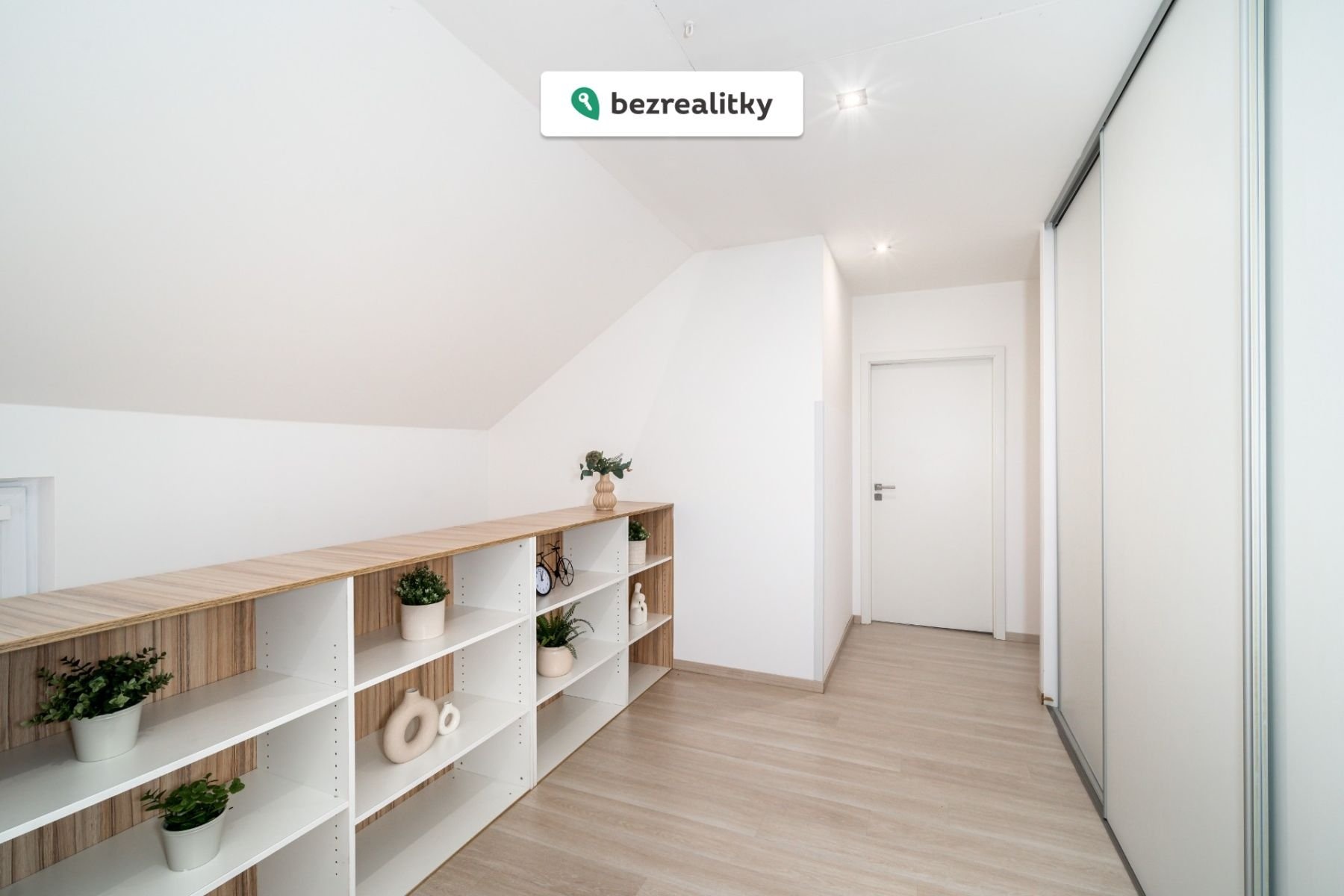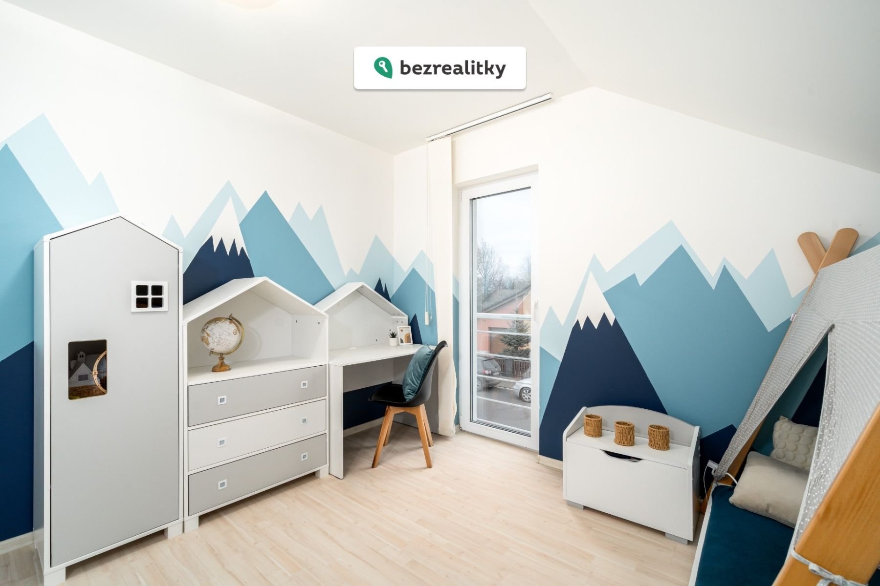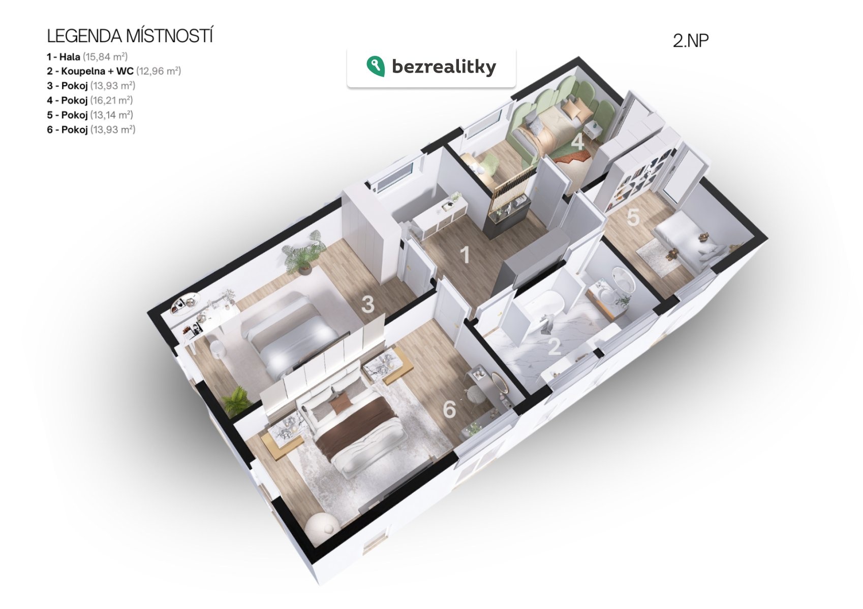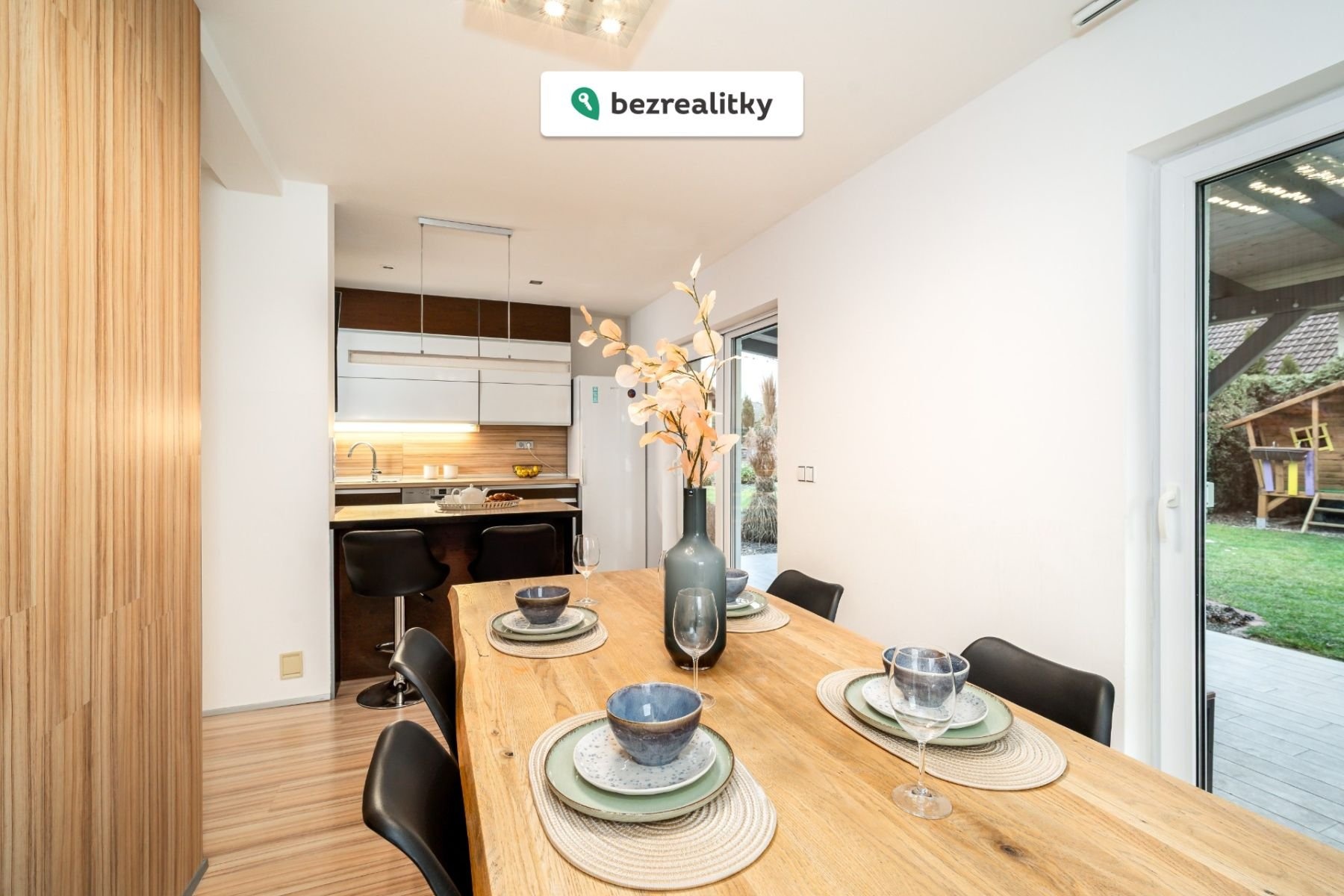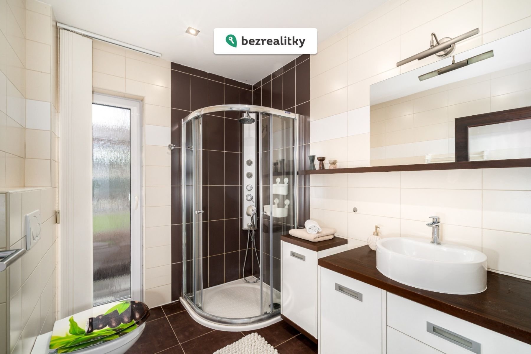 Ráno děti sbíhají po schodech do světlého obýváku s kuchyní a jídelnou, vy v zádveří odkládáte bundy a boty do vestavěných skříní. V kuchyni voní snídaně, za velkými francouzskými okny už je vidět terasa a zahrada, kam můžete kdykoli vyjít. Hlavní ložnice v přízemí je váš klidný úkryt s vlastní koupelnou se sprchovým koutem a WC. V patře je hala s vestavěnou skříní a čtyři ložnice – ideální pro děti, hosty, pracovnu či hernu. Ranní provoz zvládne velkorysá koupelna s vanou, dvěma umyvadly a WC.