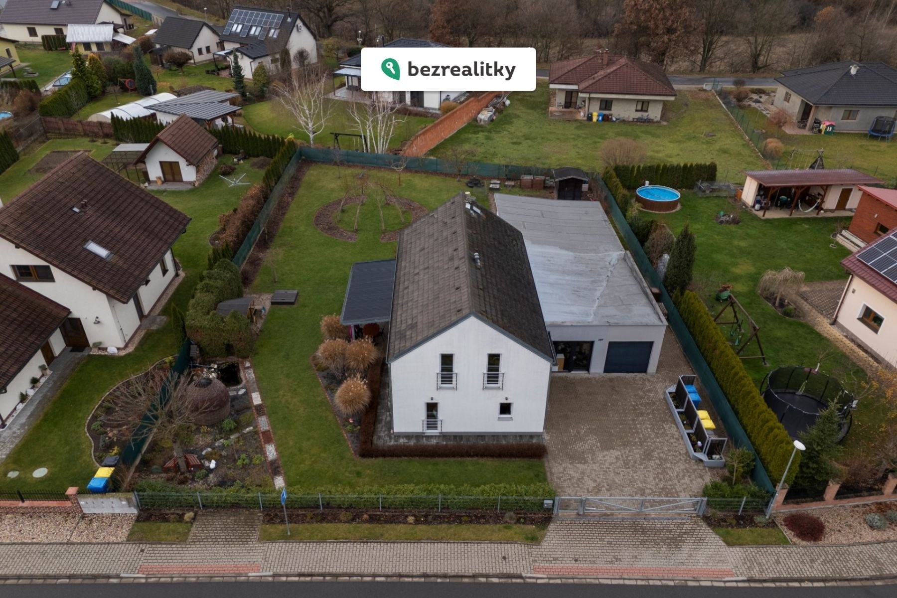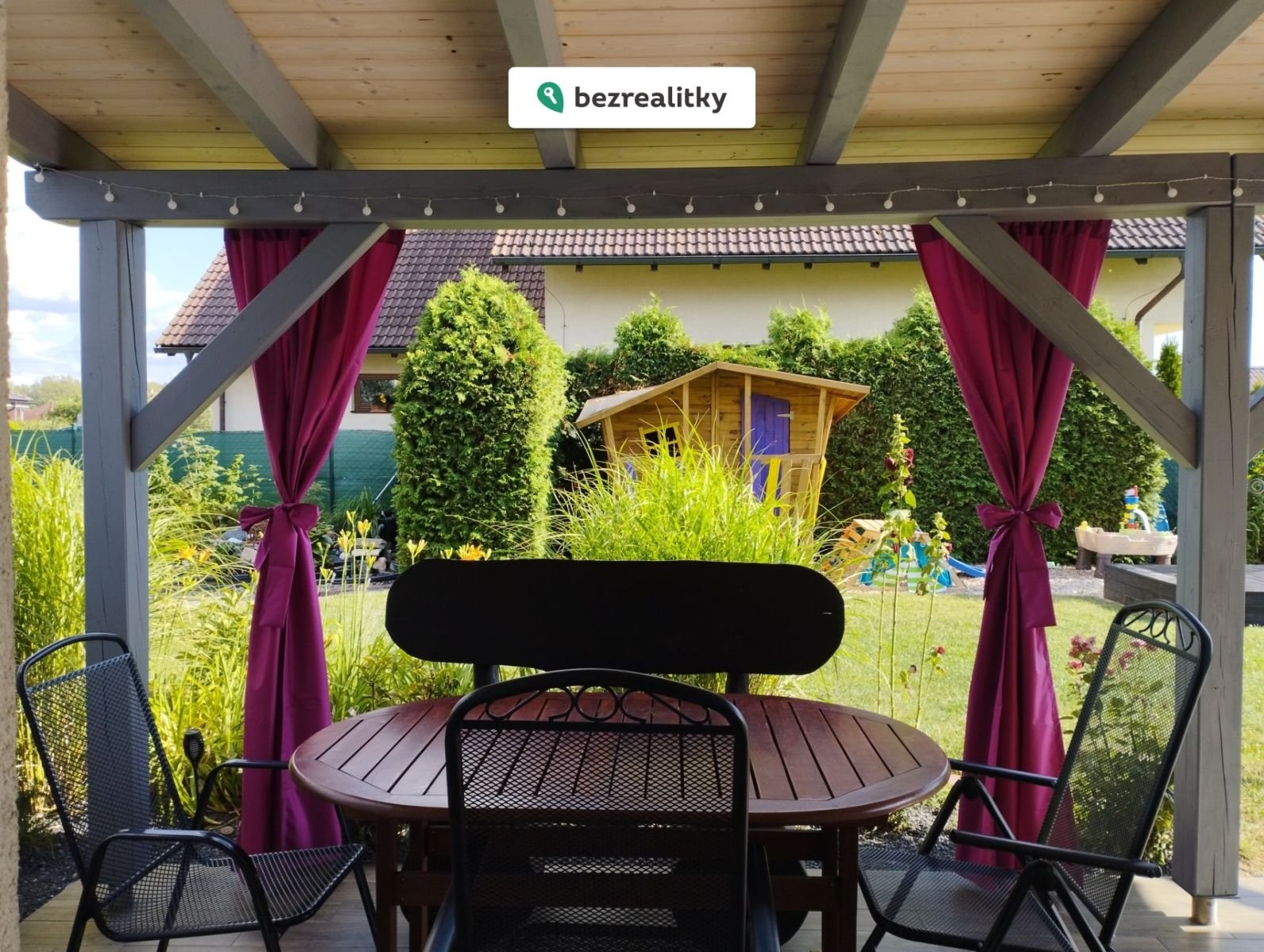 Z obýváku i ložnice vyjdete na zastřešenou terasu o 22 m², která je od jara do podzimu vaším druhým obývákem. Zahrada, navržená zahradním architektem, je hotový příběh: ovocné stromy a keře, plantáž jahod (cca 200 kusů), zvýšené záhony se zeleninou, jezírko, živý vrbový altán i zákoutí pro večerní posezení. Děti mají svůj svět – vrbový domek, hrací domeček, pískoviště, senzomotorický chodník, hmyzí domek i bylinkovou zahrádku. Zahrada je kompletně oplocená a ze tří stran krytá vzrostlými tújemi a habry.