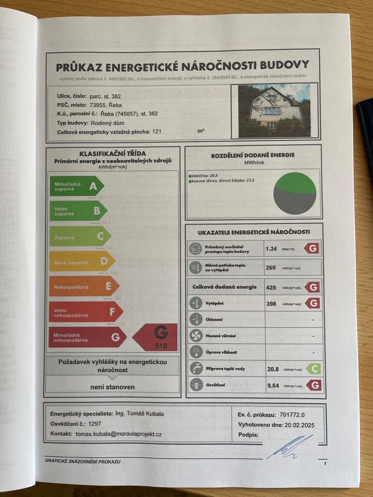 - Ukazatel energetické náročnosti budovy: 518 kWh/m²