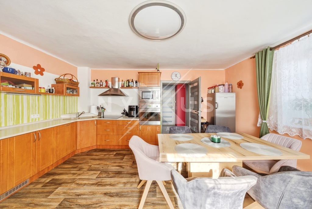 Dispozice domu nabízí prostorný obývací pokoj, samostatnou kuchyň s jídelnou, tři další pokoje a dvě koupelny (s vanou i sprchovým koutem). Vytápění je řešeno centrálně automatickým kotlem na tuhá paliva, ohřev vody zajišťuje bojler. Dům je napojen na veřejnou kanalizaci a obecní vodovod, k dispozici je také vlastní studna, elektřina 230/400 V a plyn na hranici pozemku.
