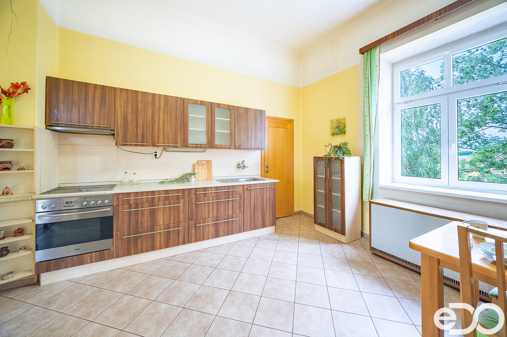 Byt má funkční a promyšlené uspořádání: z chodby vstupujete do koupelny s WC, do prostorné kuchyně s jídelním stolem a spíží, a také do velkého obývacího pokoje. Na ten navazuje ložnice a menší zadní pokoj – ideální jako pracovna, šatna nebo prostor pro domácí podnikání.