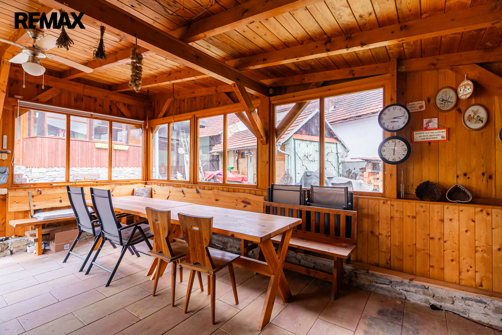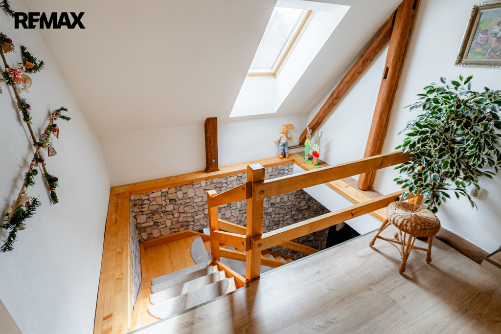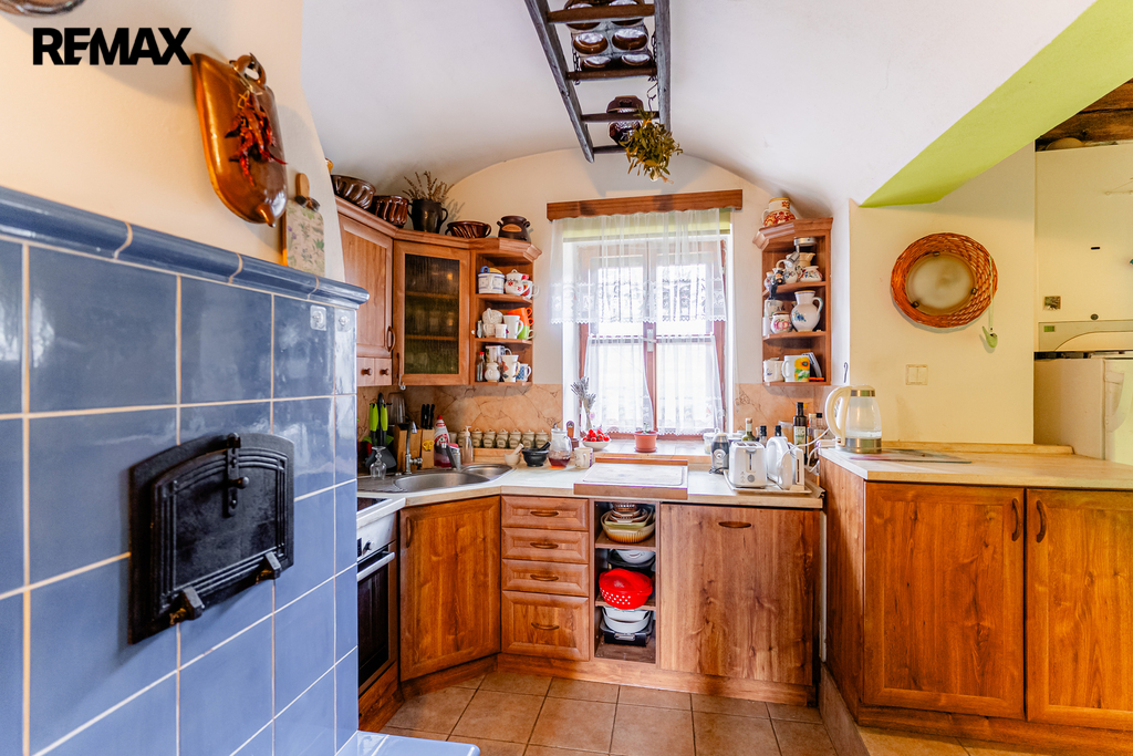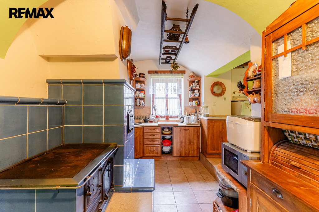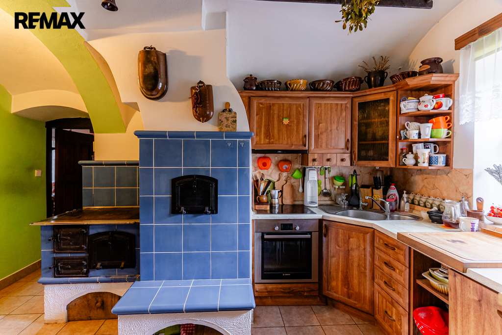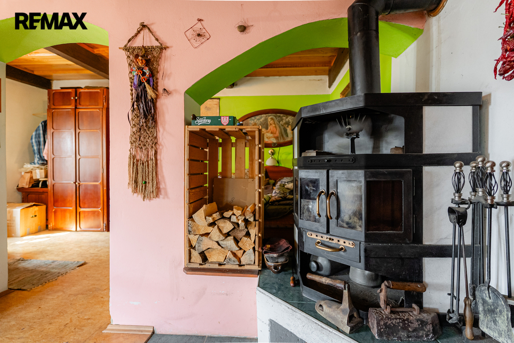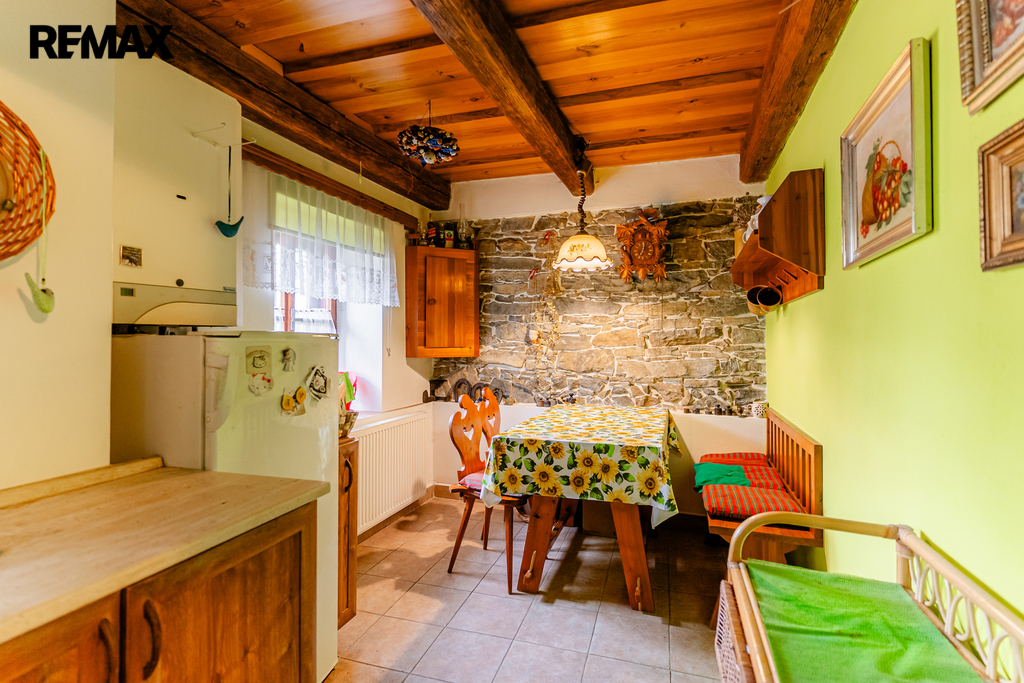 V interiéru najdete dřevěná okna, přiznané trámy a další autentické prvky, které dodávají domu jedinečný charakter jako například přiznaná stěna z kamenů v jídelně. V kuchyni jsou původní kachlová kamna, další kamna lze využít i v obytném pokoji. Podlahy v přízemí (kuchyně, chodba a koupelna) jsou temperované.