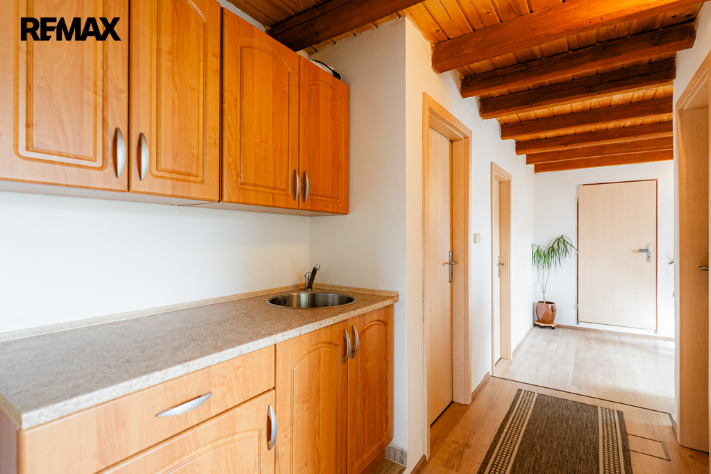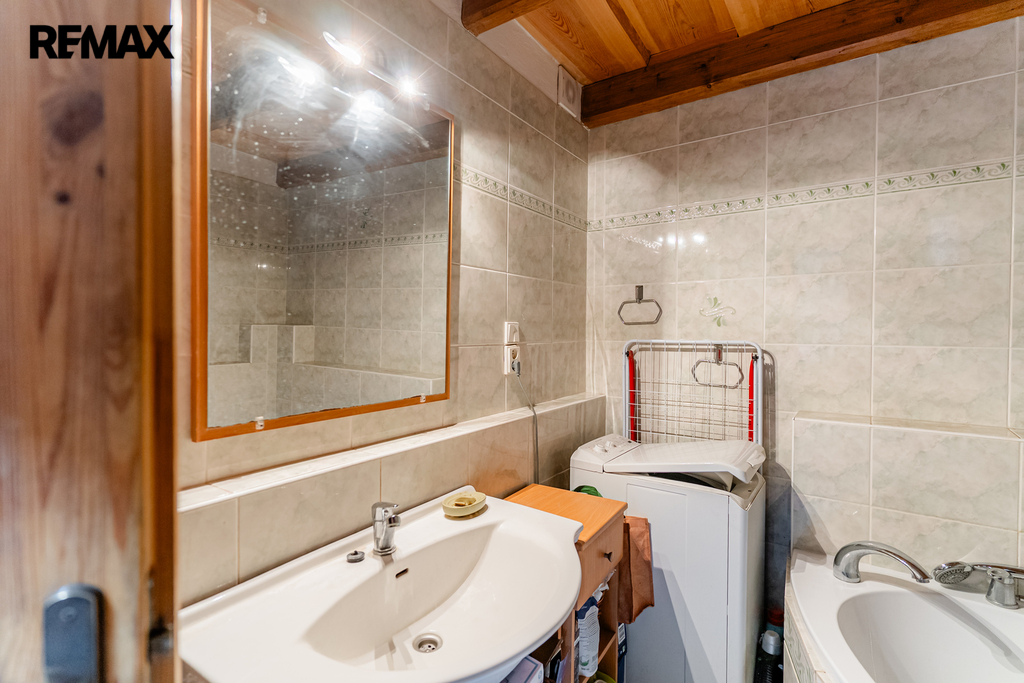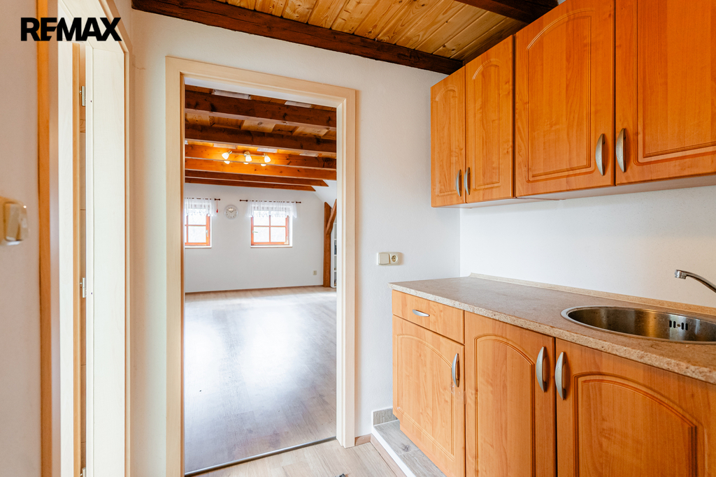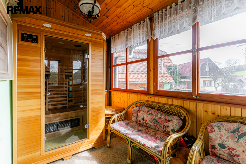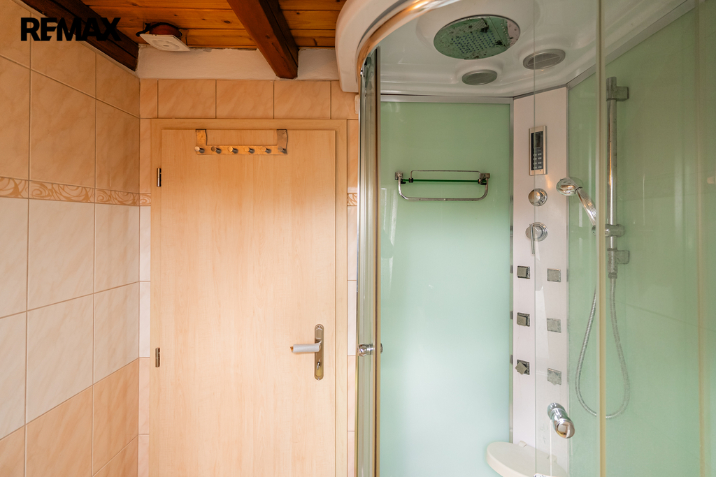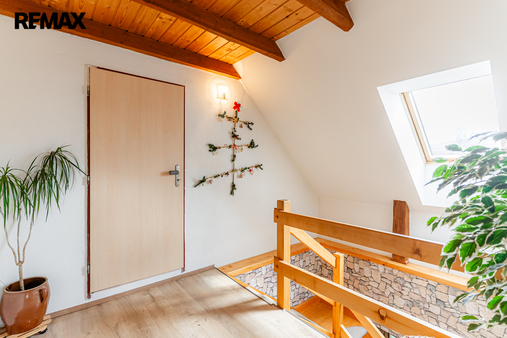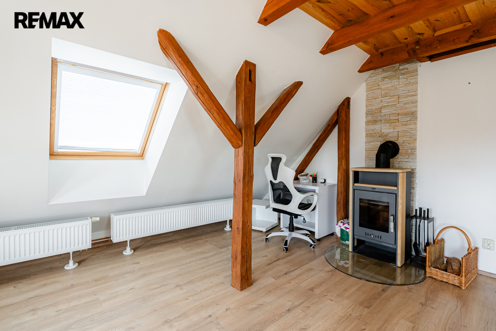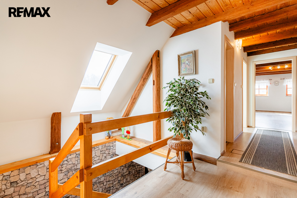V interiéru najdete dřevěná okna, přiznané trámy a další autentické prvky, které dodávají domu jedinečný charakter jako například přiznaná stěna z kamenů v jídelně. V kuchyni jsou původní kachlová kamna, další kamna lze využít i v obytném pokoji. Podlahy v přízemí (kuchyně, chodba a koupelna) jsou temperované.