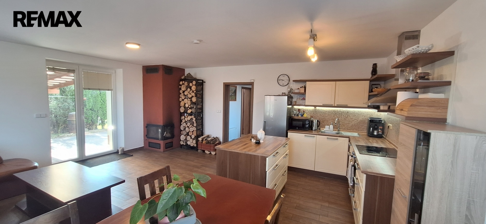 Dispozičně je dům řešen jako otevřený a vzdušný prostor tvořený obývacím pokojem s krbem, jídelní částí a kuchyňským koutem s praktickým ostrůvkem. Dále se v domě nachází dva samostatné pokoje (aktuálně využívané jako ložnice a dětský pokoj), koupelna s WC, technická místnost a zádveří s vestavěným úložným prostorem.