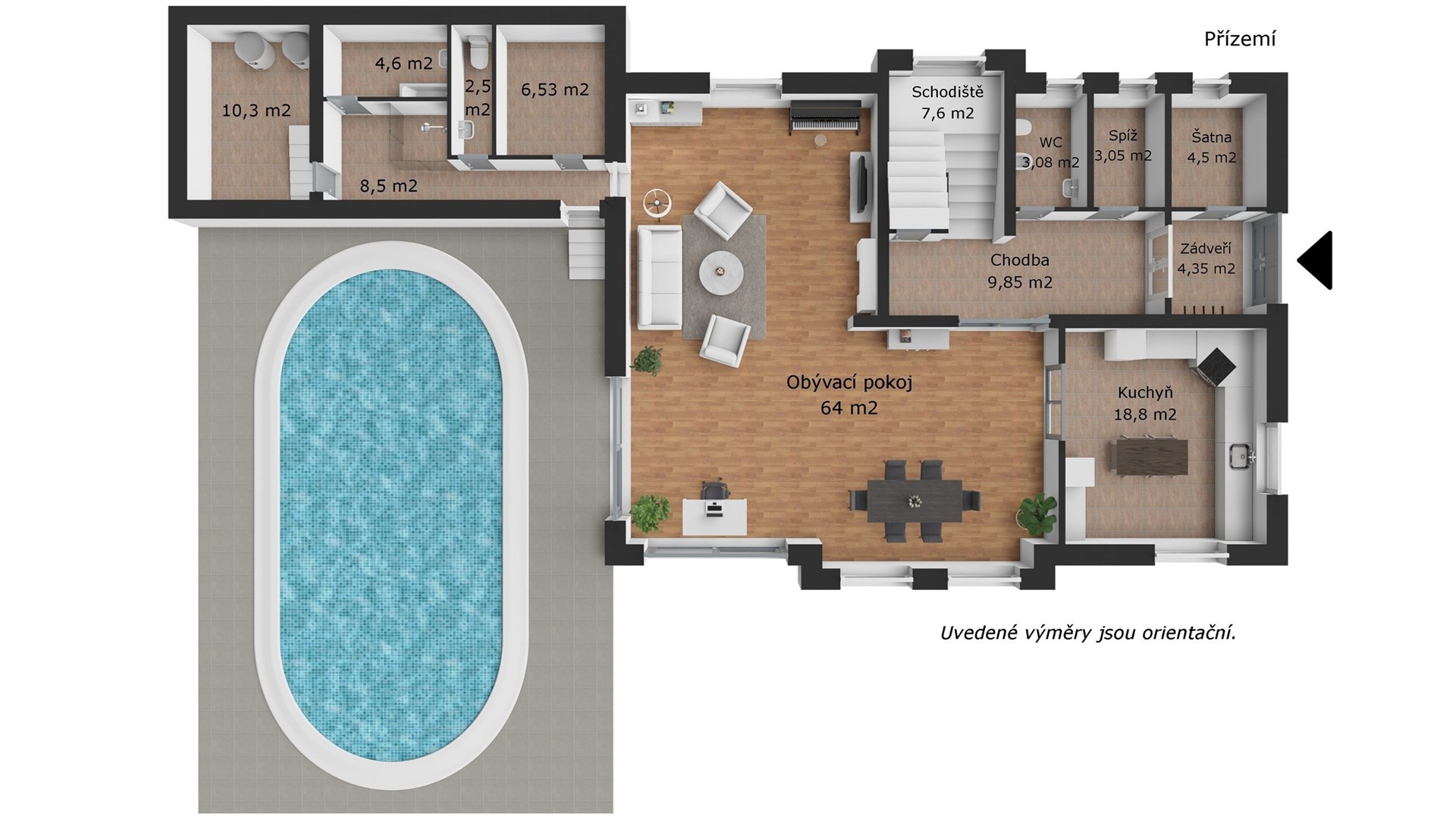 – Přízemí (147 m²): dominantou je velkorysý obývací pokoj s krbem propojený s kuchyní a jídelnou. Odtud je vstup na terasu a k bazénu. Nechybí šatna, spíž, sprchový kout, 2x toaleta, prádelna a technické zázemí.