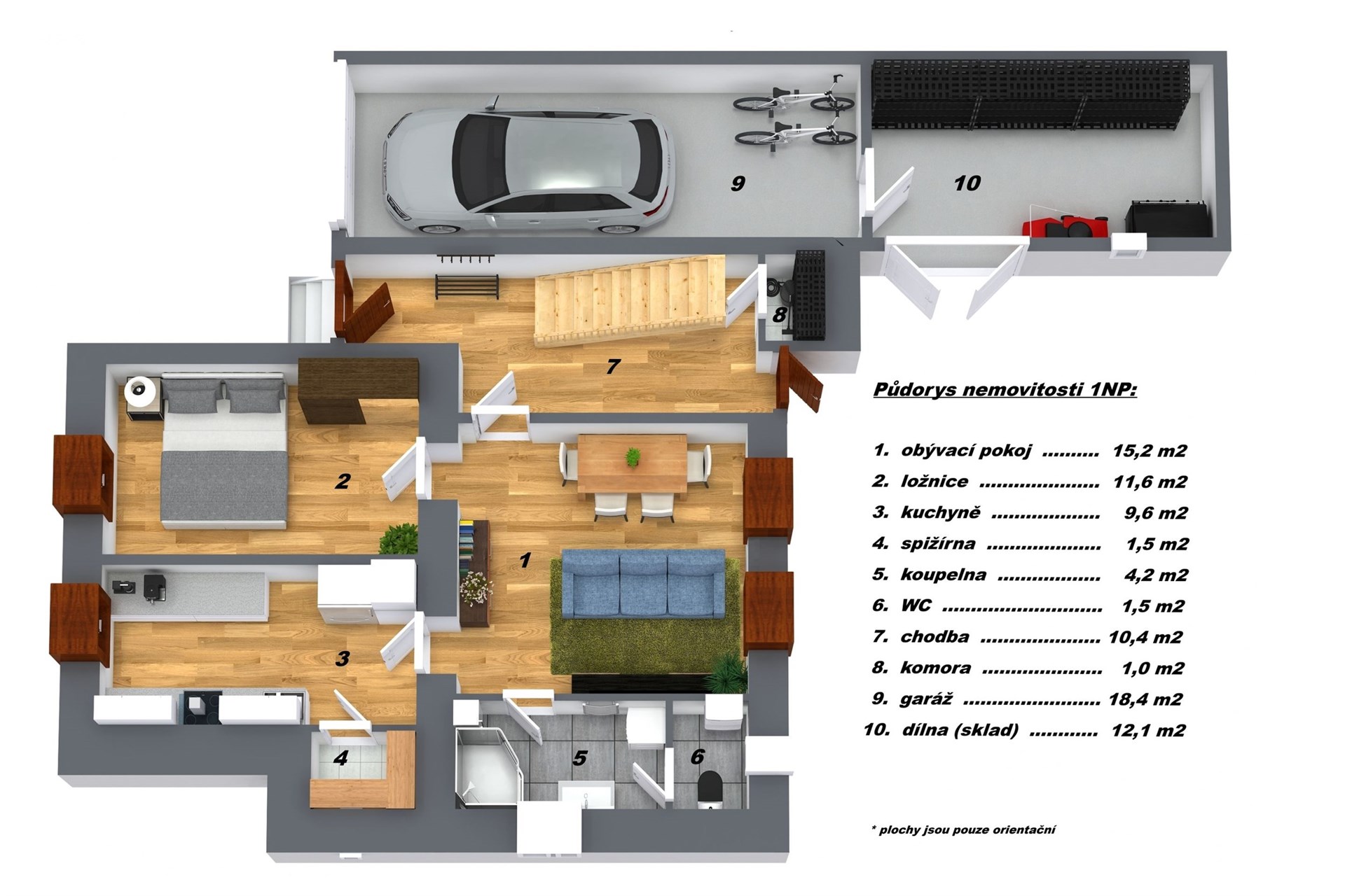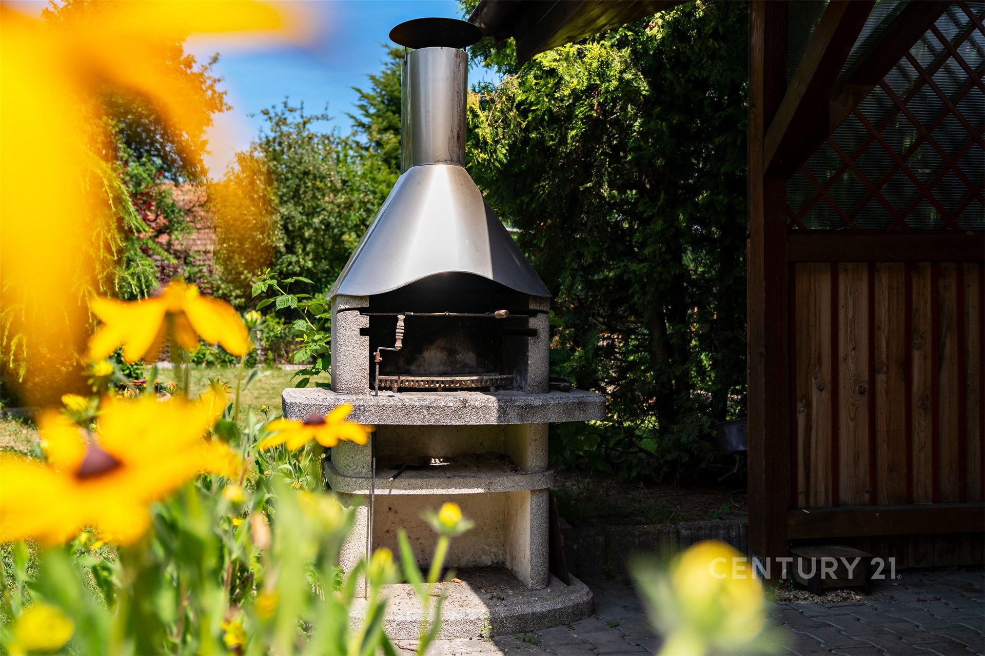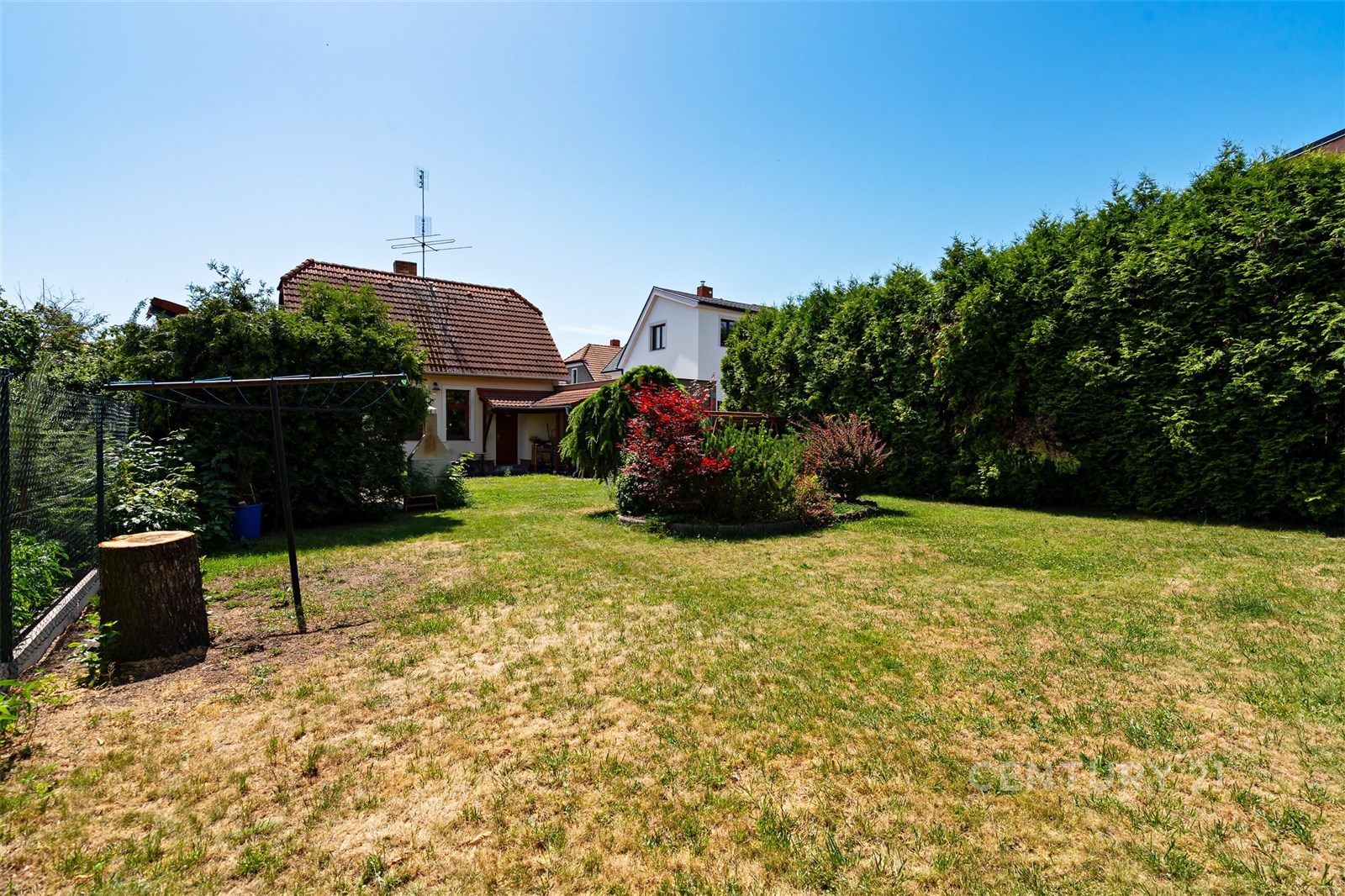 Zahrada je ideální pro odpočinek i setkávání s přáteli – najdete tu krytou pergolu s krbem, zděný zahradní domek, který může sloužit jako dílna, zimní posezení nebo sklad. Prostorná garáž umožňuje parkování i vyššího vozu nebo dodávky a navazující vytápěný prostor se hodí jako dílna nebo pro uskladnění sportovního vybavení.