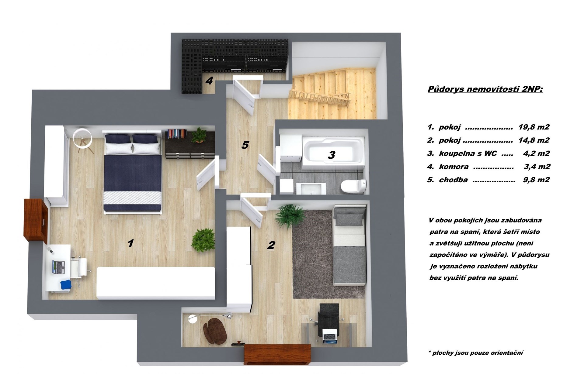 Tento dům s dispozicí 4+1 je ideální volbou pro rodinu, pár i každého, kdo hledá pohodlné bydlení bez dalších investic. V přízemí najdete obývací pokoj, ložnici, kuchyni se spižírnou a koupelnu s toaletou. Praktická komora v chodbě nabízí další úložný prostor. Z chodby je vstup do menšího sklepa. V patře se nacházejí dva útulné pokoje, v obou jsou vybudována patra na spaní, která chytře šetří místo a zvětšují užitnou plochu. Ani zde nechybí koupelna s toaletou a další komora.