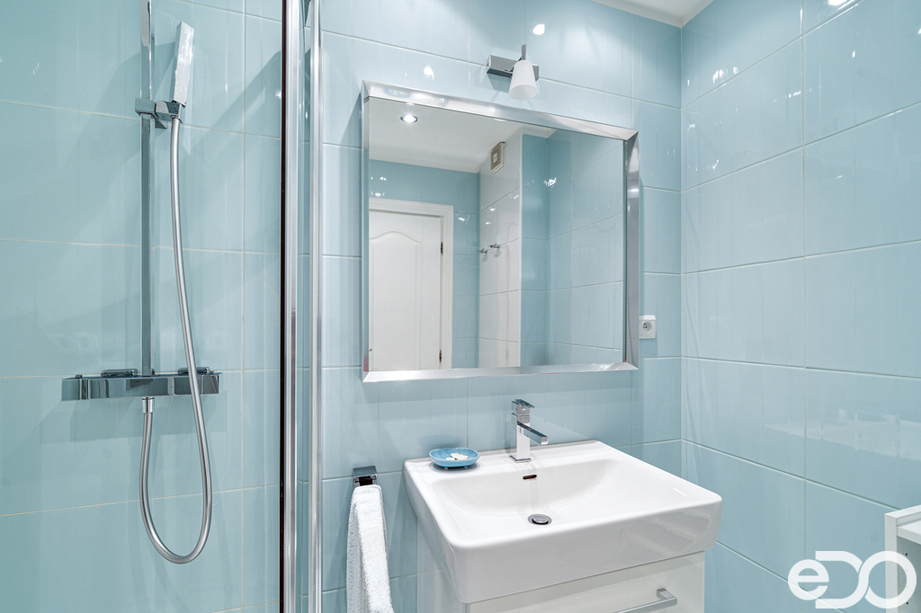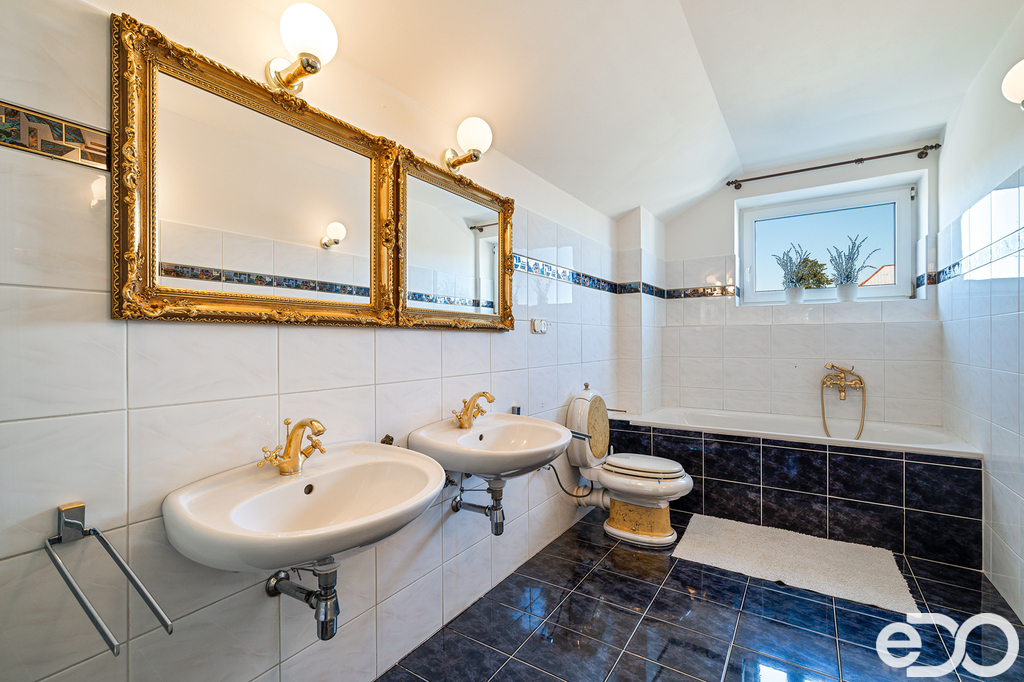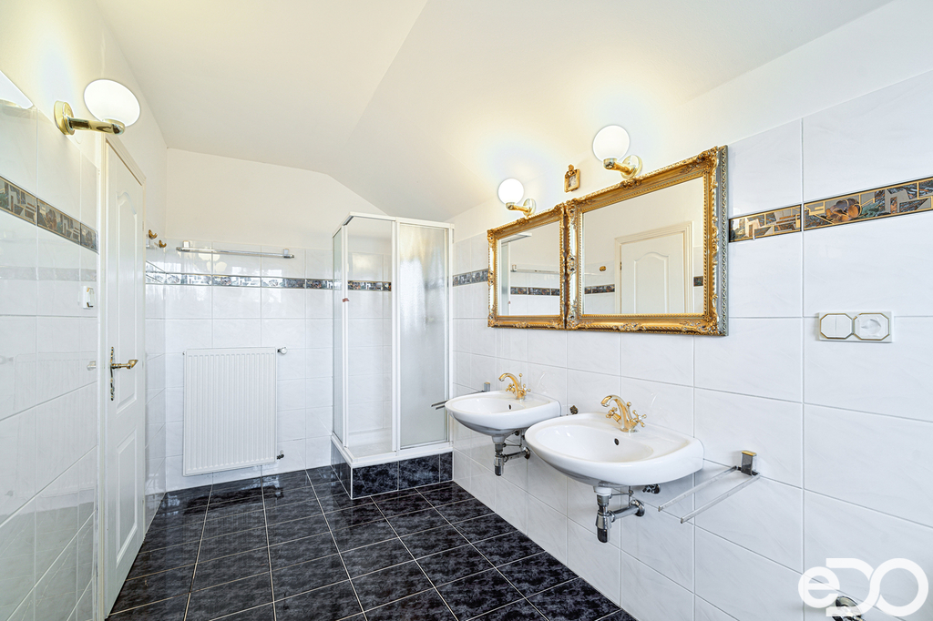 Koupelna z ložnice s vanou i sprchovým koutem, dvěma umývadly, WC. Koupelna z druhého pokoje, stejně jako v samostatné jednotce, se sprchovým koutem, umývadlem a WC.