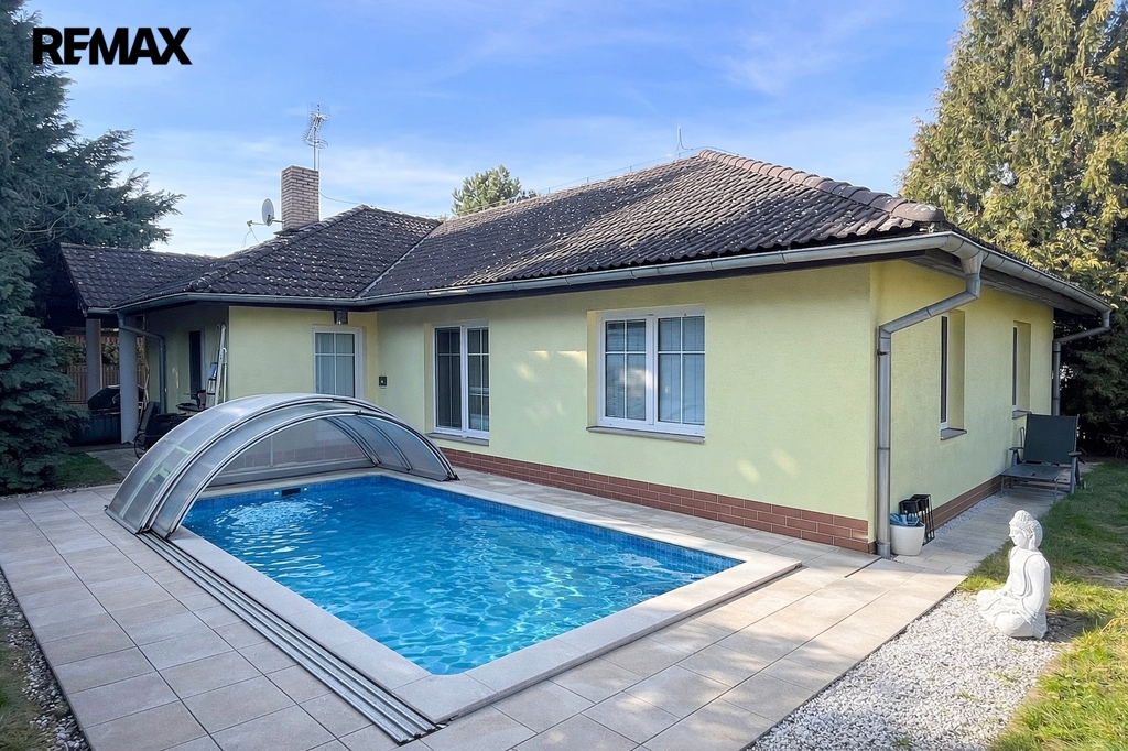 K prodeji prostorný, přízemní RD 4+kk, dvougaráž, venkovní bazén, zahrada, Šestajovice u Prahy.