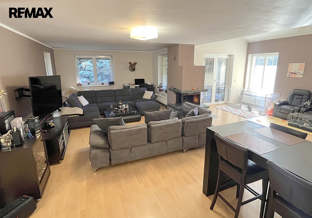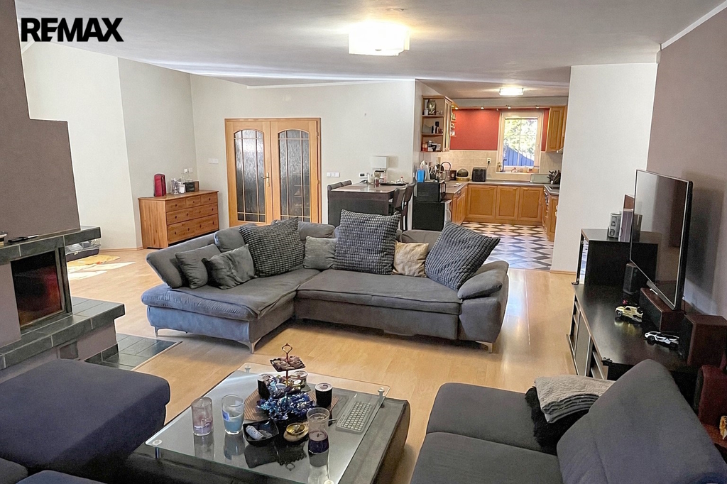 Dominantou interiéru je prostorný, světlý obývací prostor s krbovými kamny, plynule navazující na jídelní část a kuchyň vybavenou vestavěnými spotřebiči. Velká okna a přímé vstupy na terasu propojují interiér se zahradou a vytvářejí příjemnou atmosféru pro každodenní rodinný život i společenská setkání.