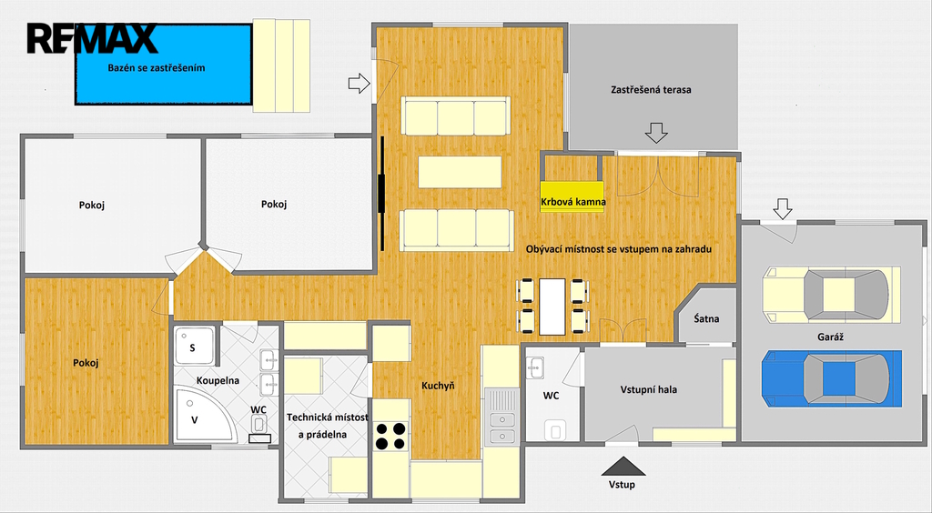 Z obývacího pokoje vedou dva vstupy na krytou terasu, která přechází do zahrady se zastřešeným venkovním bazénem – ideální místo pro relaxaci i letní posezení.