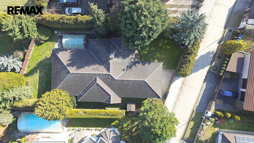 Dům stojí na pozemku o velikosti 776 m² a nabízí udržovanou zahradu se vzrostlými stromy, která poskytuje dostatek soukromí i příjemné prostředí pro odpočinek. K dispozici krytá terasa, zastřešený venkovní bazén a dostatek prostoru pro relaxaci i rodinné aktivity.