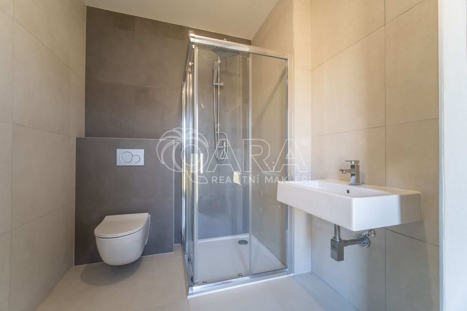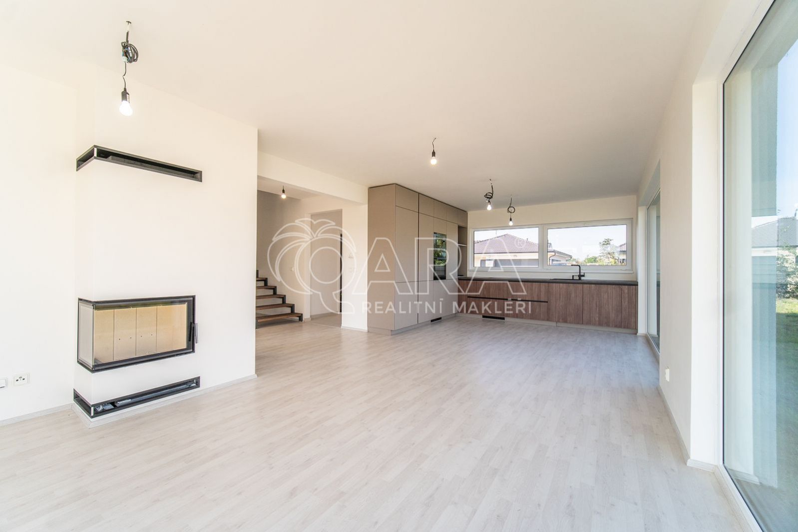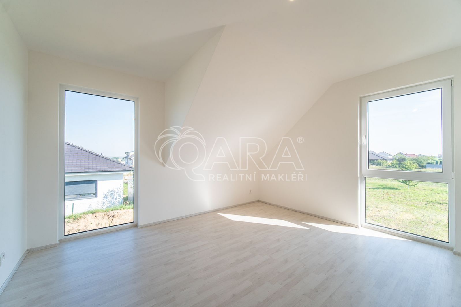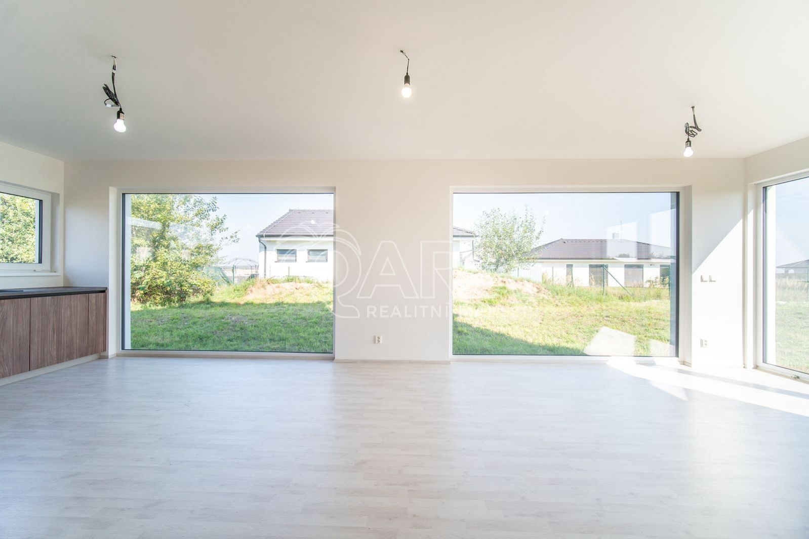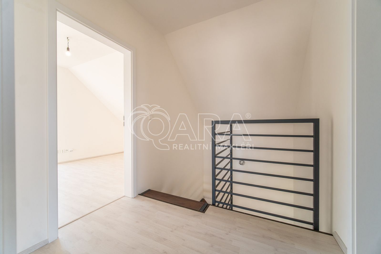 Po vstupu do domu vás přivítá vstupní hala, u které se nachází koupelna se sprchovým koutem, toaletou a technickým zázemím. Vstupní prostor je zařízen vestavěným nábytkem na míru, který ladí s designem kuchyňské linky. Chodbou se dostanete do prostorného obývacího pokoje (33 m) propojeného s kuchyňským koutem, který je vybaven kvalitními spotřebiči Siemens. Dominantou této části je krb a přímý vstup na terasu. V přízemí se dále nachází jeden pokoj (12 m), ideální jako pracovna či pokoj pro hosty, a schodiště do patra.