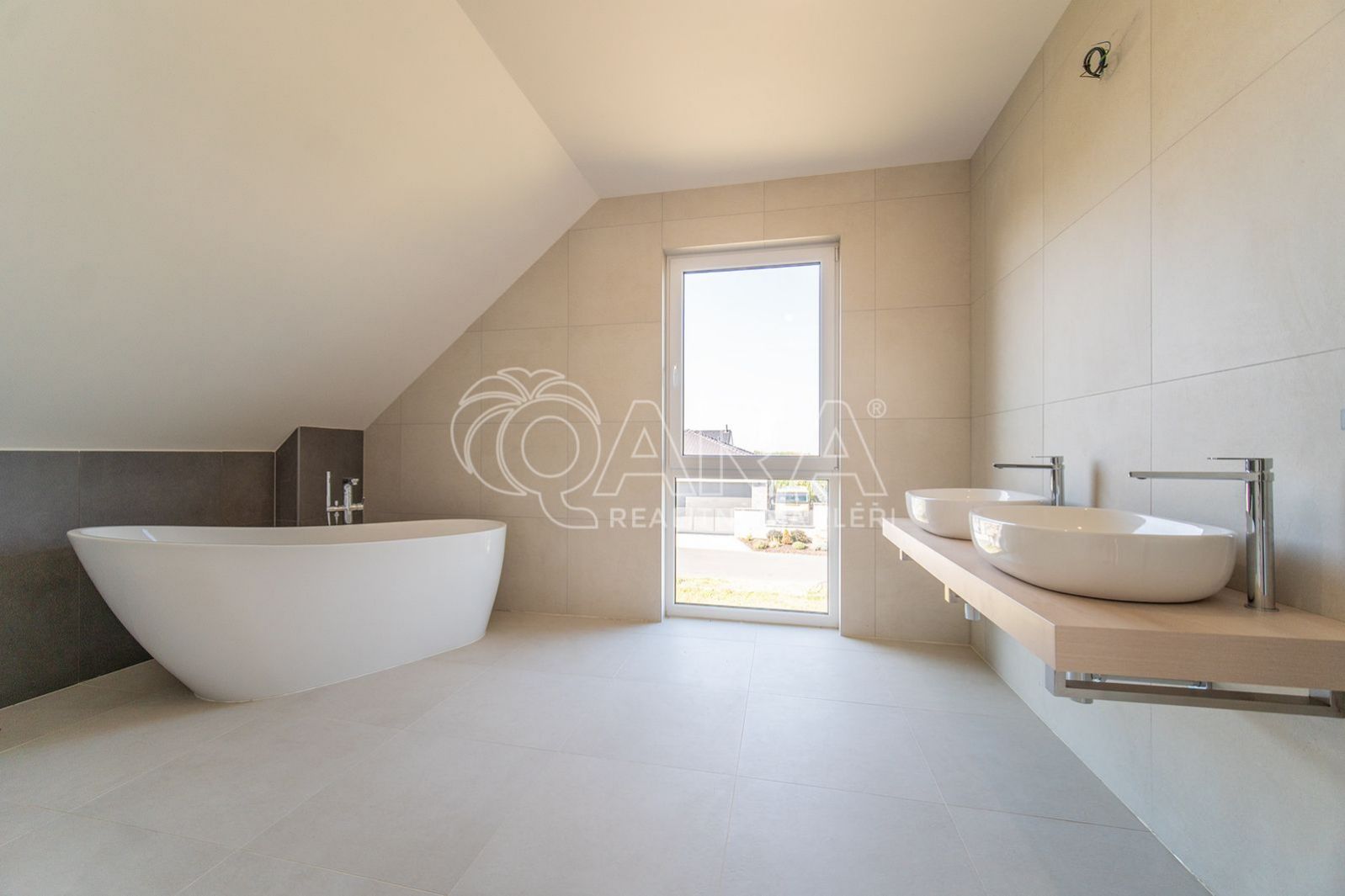 V horním patře jsou tři ložnice (16,73 m, 16,73 m a 12,16 m) a prostorná koupelna s vanou, dvojumyvadlem a toaletou.