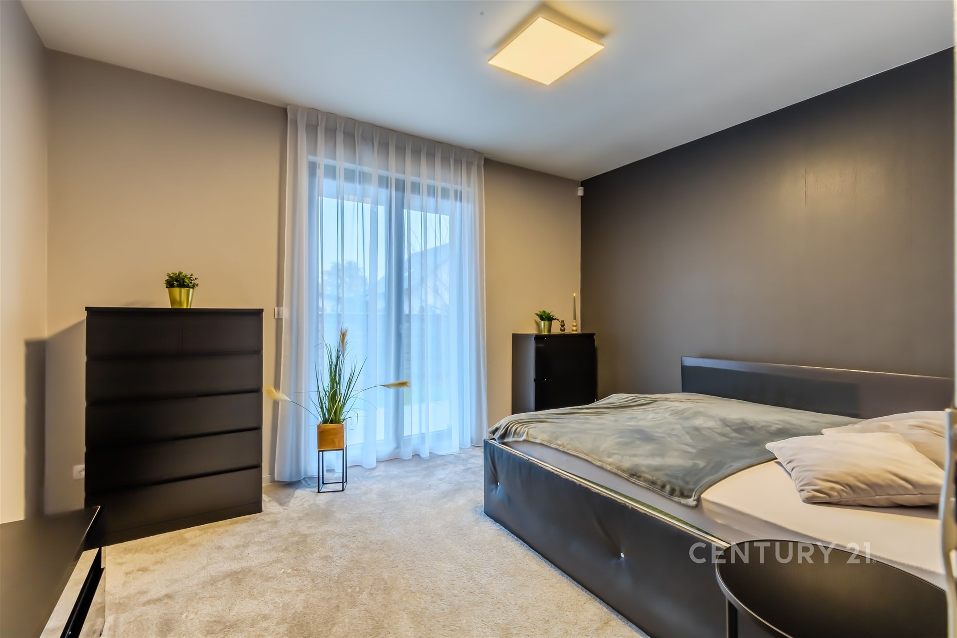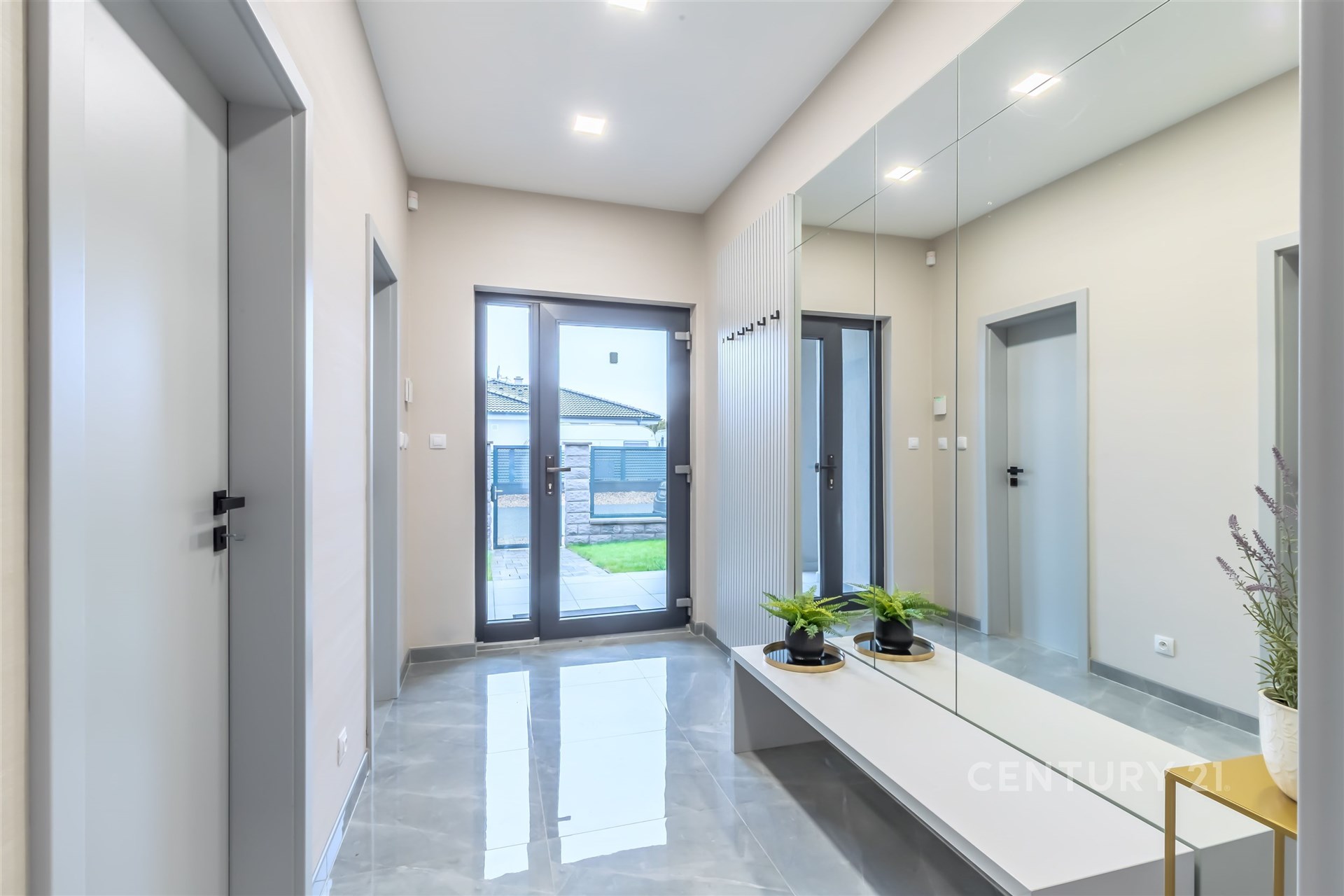 Interiér domu je plně zařízený s důrazem na moderní design a funkčnost. Díky velkým oknům je interiér velmi světlý a vzdušný.